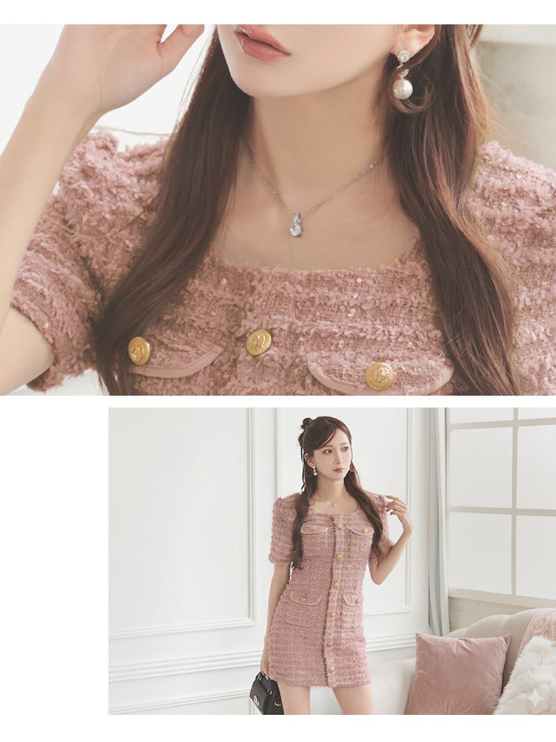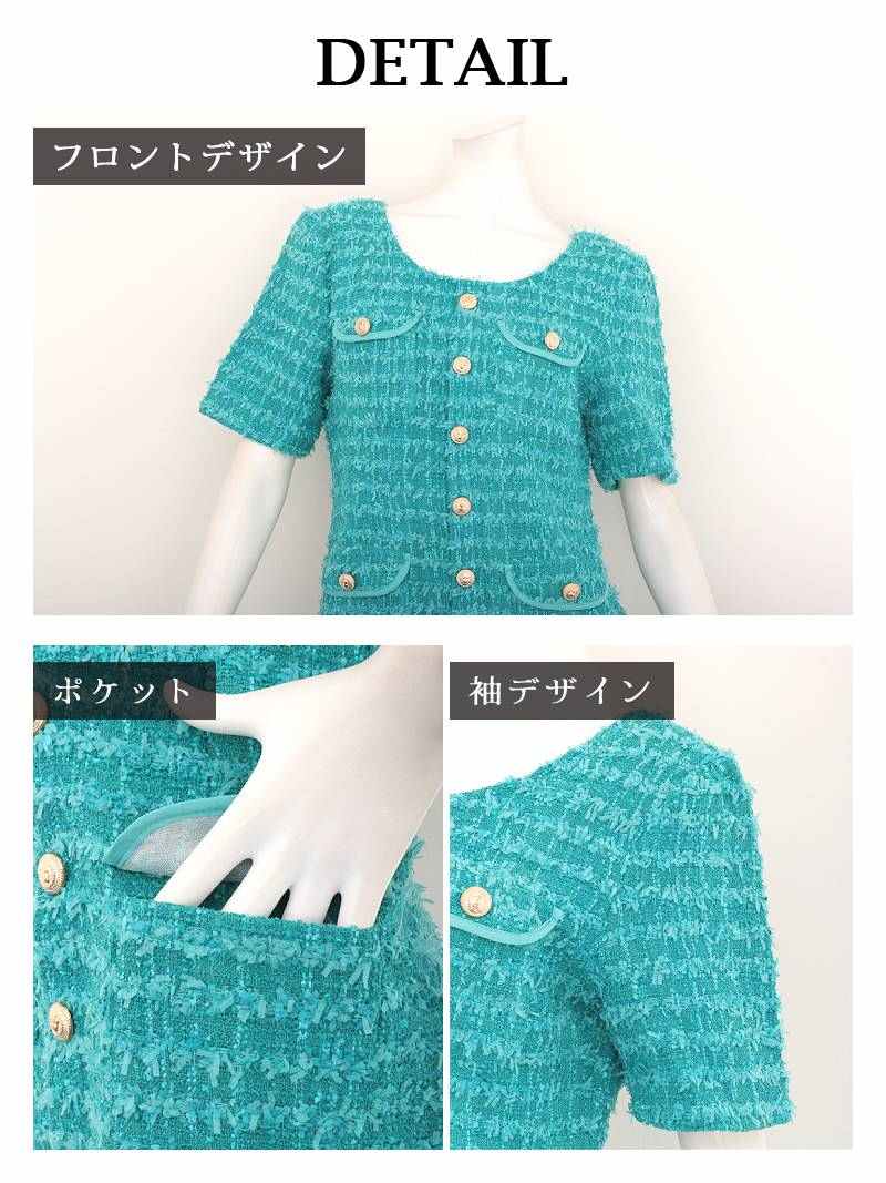 上質な厚手ツイードとゴールドボタンが目を惹く、大人可愛いドール風ミニドレス! ※一部予約販売※高級感のある厚手ツイードにフリンジをあしらった大人可愛いドール風半袖ミニドレス 【Ryuyu】(S/M/L/XL(2L))(グリーン/ピンク)