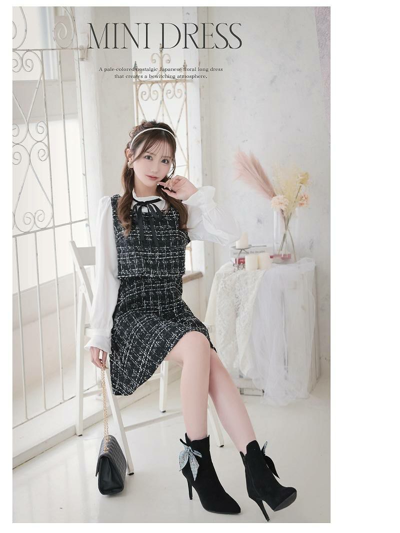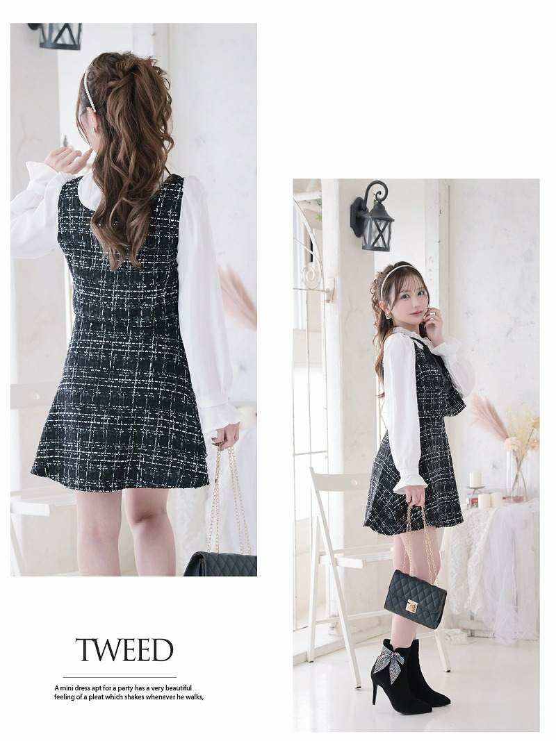 3. 上品セットアップ風ボータイリボンのミックスツイードミニドッキングワンピ りせり 着用キャバワンピース【Ryuyu】(S/M/L/XL(2L))(ブラック)