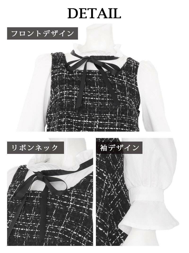 上品セットアップ風ボータイリボンのミックスツイードミニドッキングワンピ りせり 着用キャバワンピース【Ryuyu】