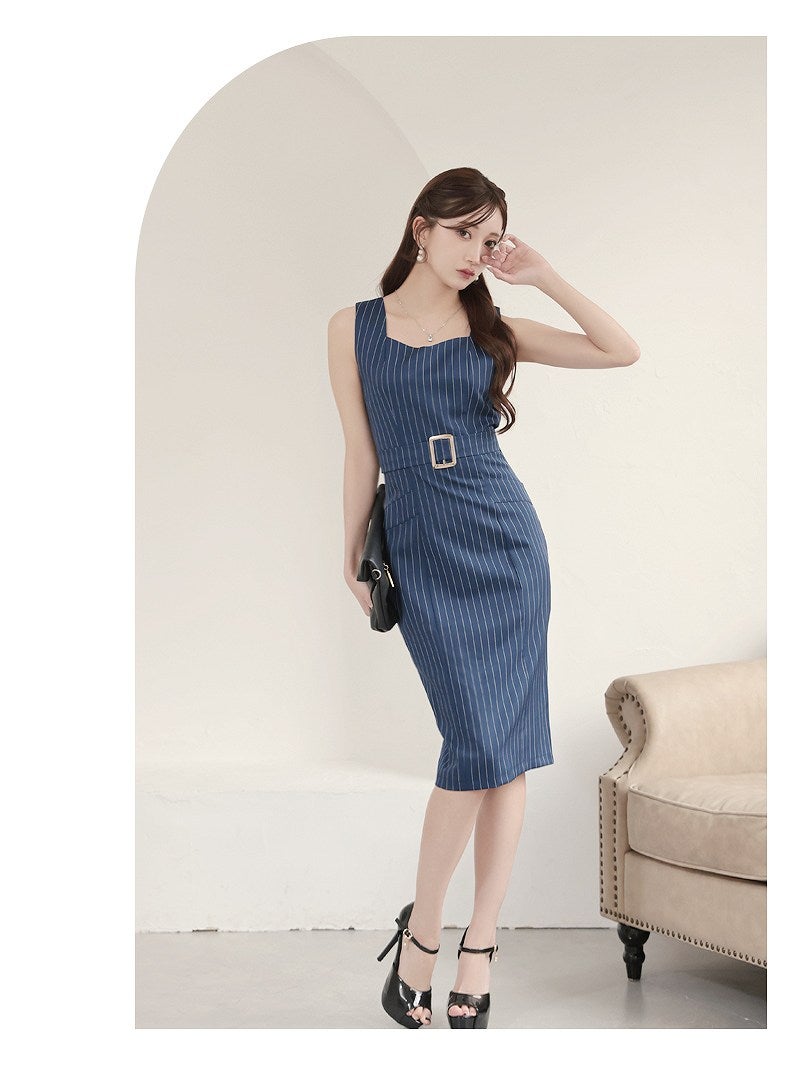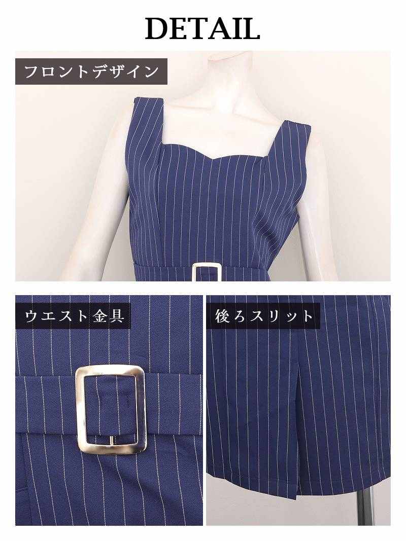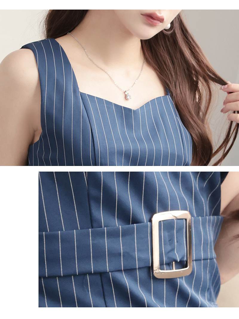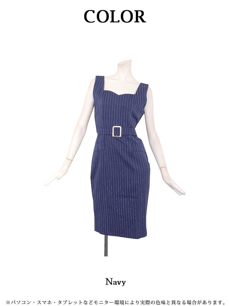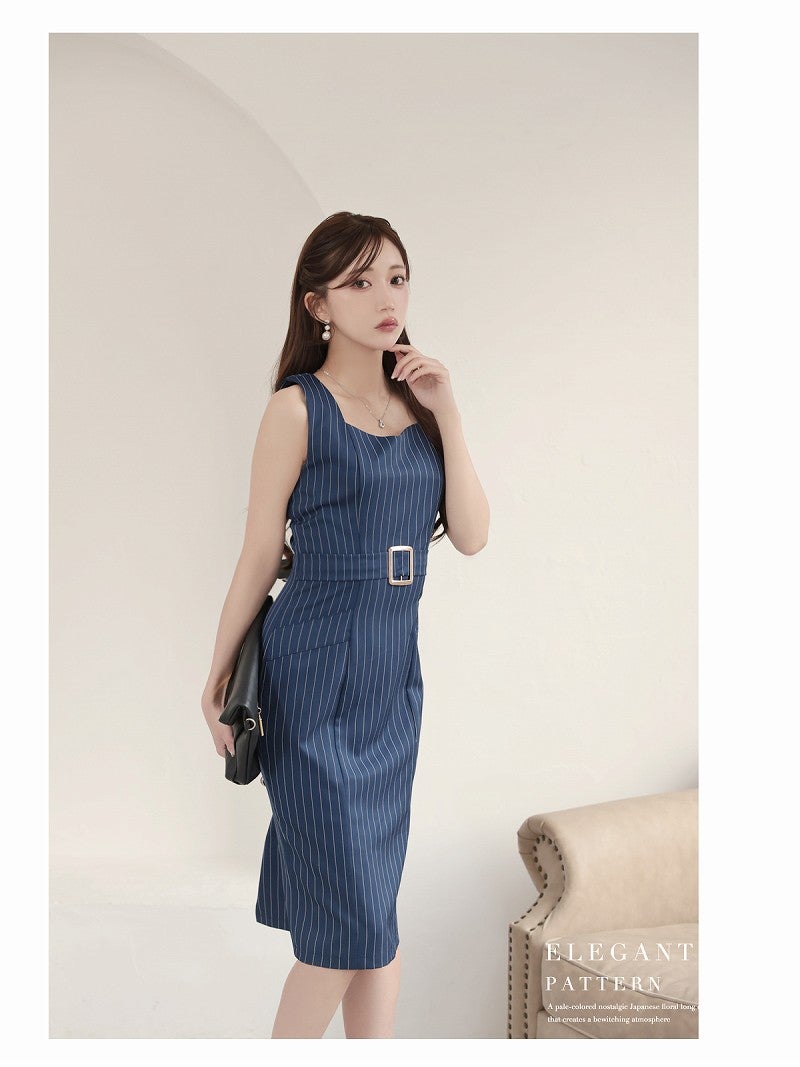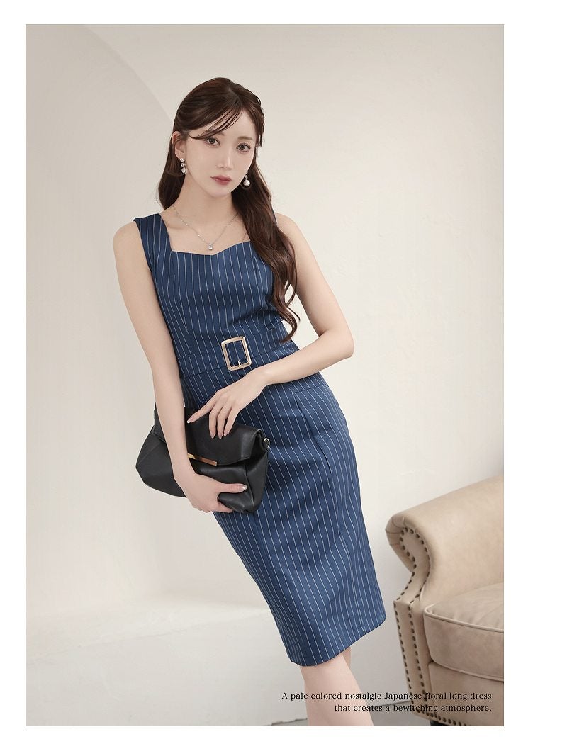 洗練されたピンストライプ柄が知的な美しさを引き立てるハイウエスト切り替えのネイビー膝丈大人ワンピース 【Ryuyu】