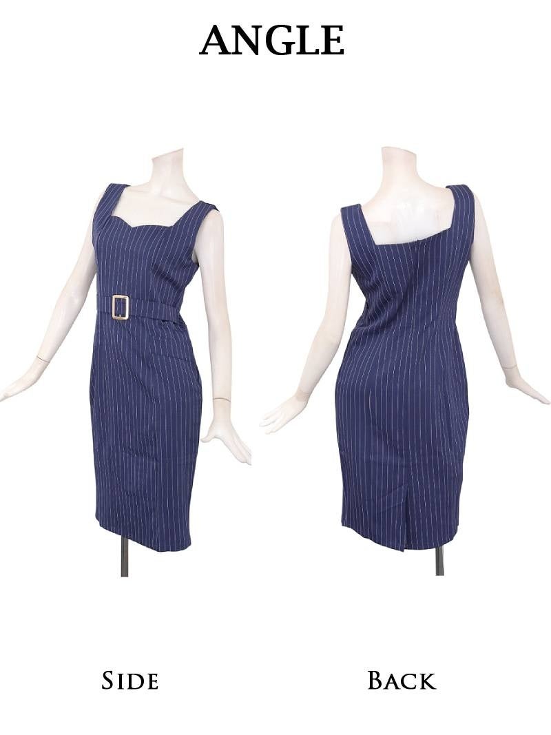 4. 洗練されたピンストライプ柄が知的な美しさを引き立てるハイウエスト切り替えのネイビー膝丈大人ワンピース 【Ryuyu】(S/M/L/XL(2L))(ネイビー)