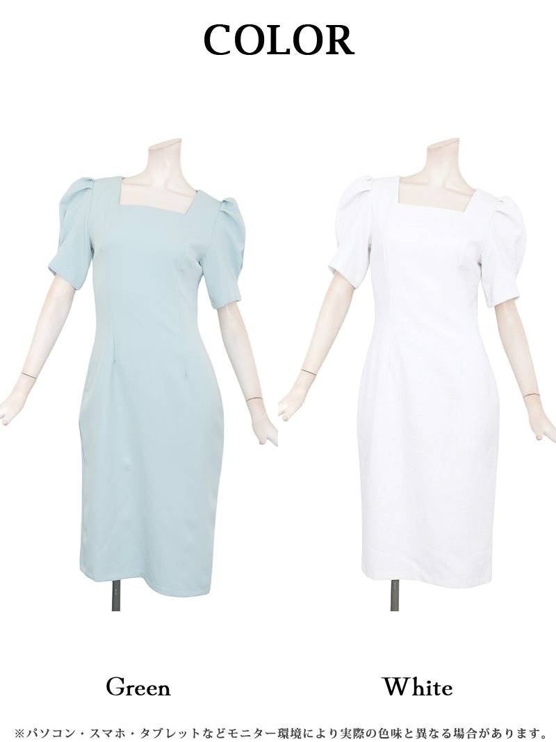4. 美デコルテを強調するスクエアネックとパフ袖が上品な大人韓国風ミディ丈キャバワンピース KANO 着用 キャバワンピース【DaysPiece】(S/M/L)(ホワイト/グリーン)