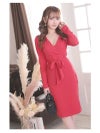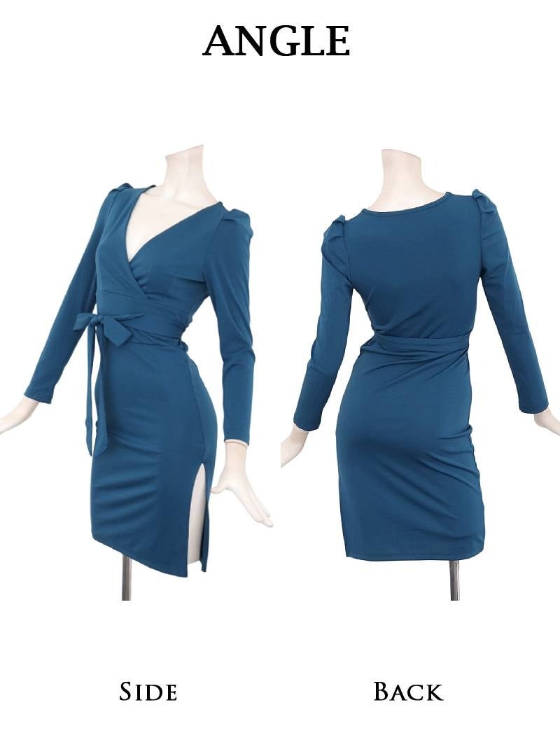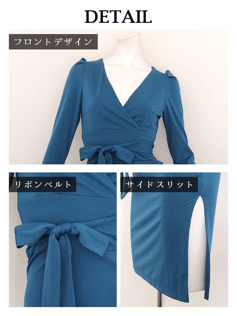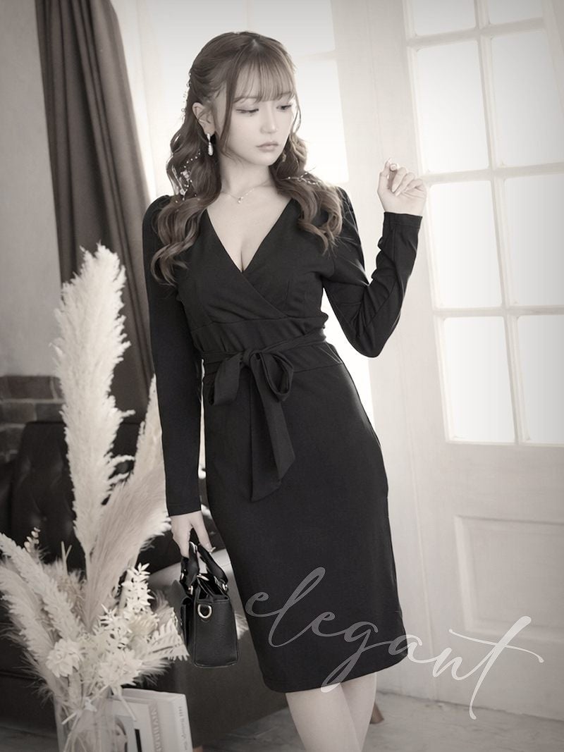 ウエストリボンでスタイルアップが叶うカシュクールデザインの膝丈タイト長袖ワンピース りせり 着用 キャバドレス【RyuyuChick】