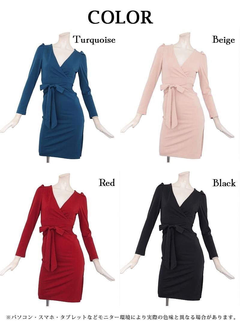 6. ウエストリボンでスタイルアップが叶うカシュクールデザインの膝丈タイト長袖ワンピース りせり 着用 キャバドレス【RyuyuChick】(S/M/L/XL(2L)/XXL(3L))(ブラック/ターコイズ/レッド/ベージュ)