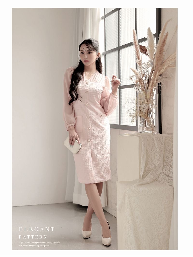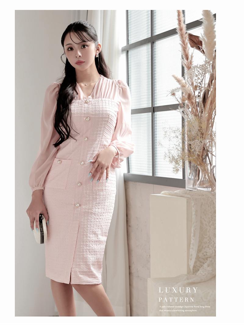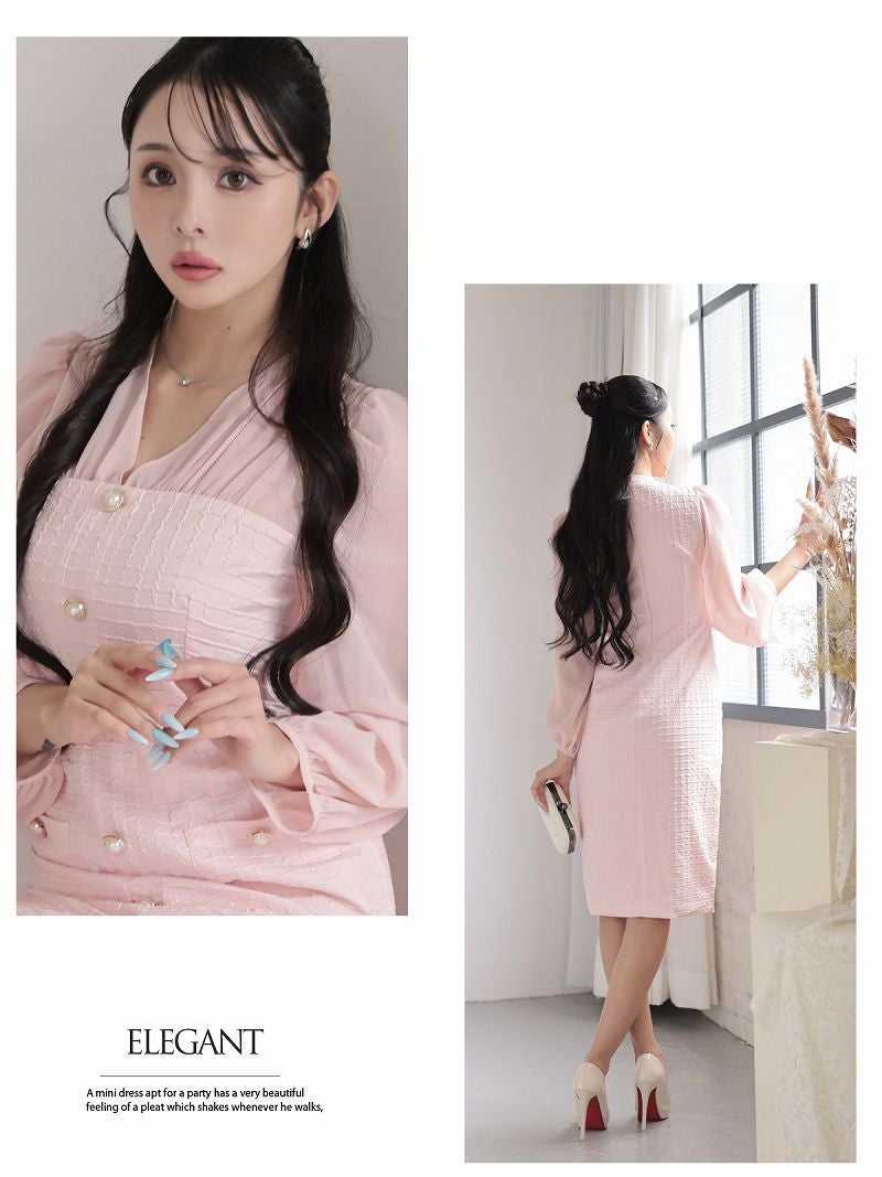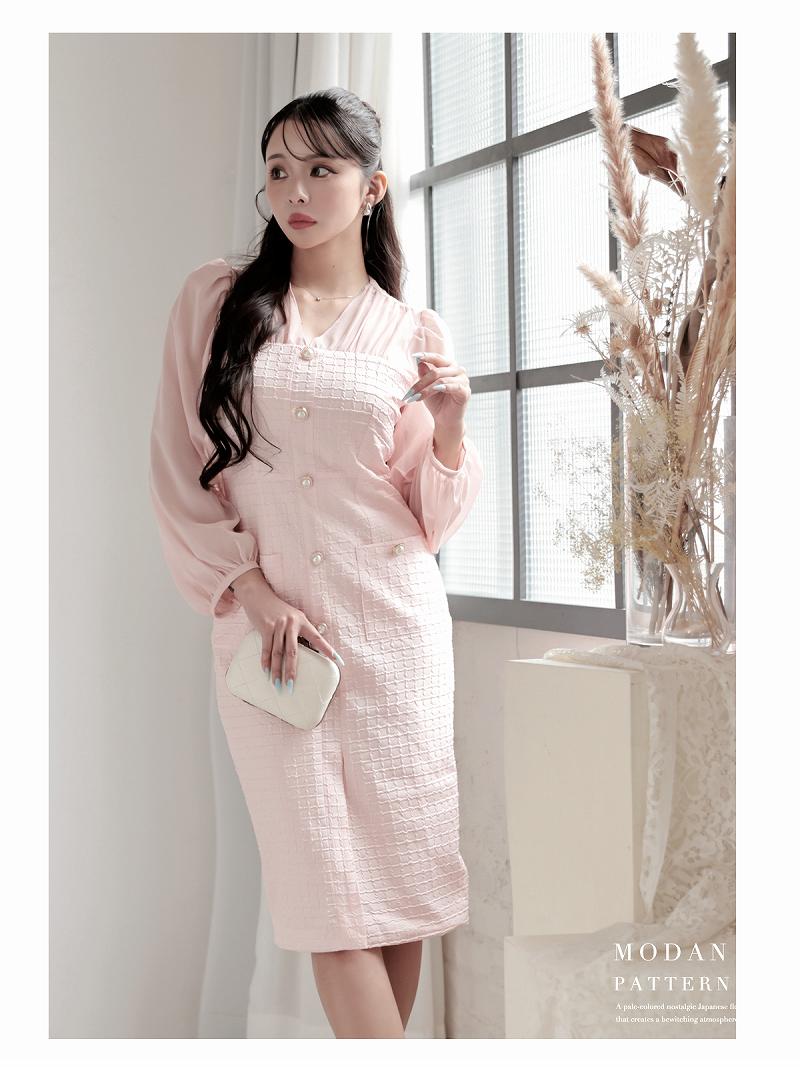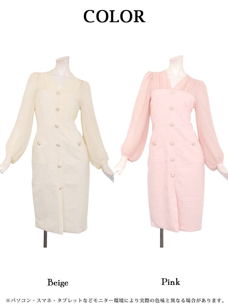 4. シフォン袖のボリューム感が大人可愛い韓国風ワッフル生地ワンピース KANO 着用 キャバワンピース【DaysPiece】(S/M/L/XL(2L))(ピンク/ベージュ)