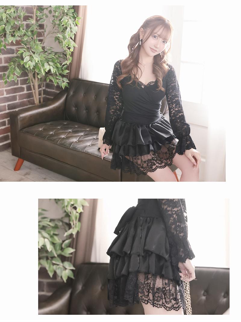 袖付きのレースが色っぽい、ウエストリボンと3段フリルが可愛い地雷系ワンピース りせり 着用 キャバドレス【RyuyuChick】