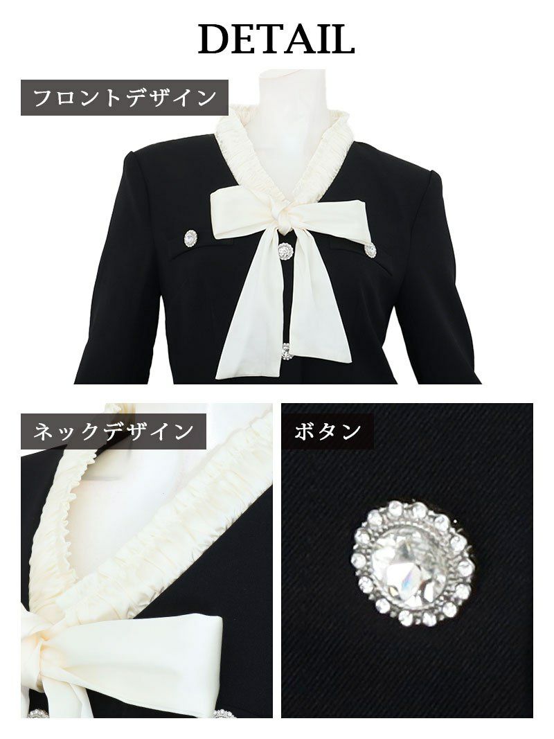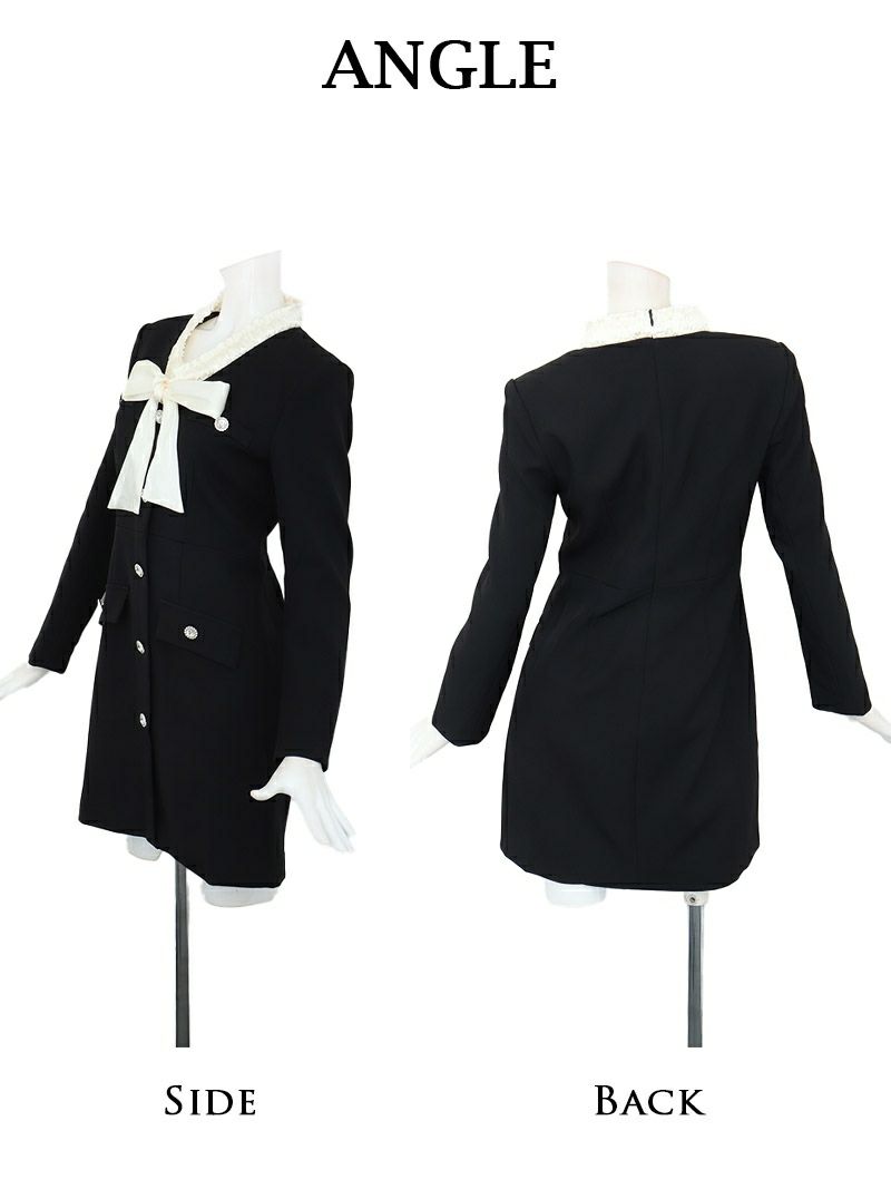バイカラーボウタイ付き パールボタン 長袖タイトミニスーツ風ドレス【Ryuyu】(S/M/L/XL(2L))(ブラック)