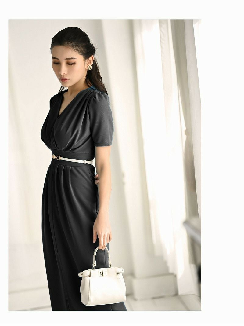 程よくボディーラインに沿うシルエットと首やデコルテを美しく魅せてくれるVネックがキレイめな印象の韓国風ワンピース。