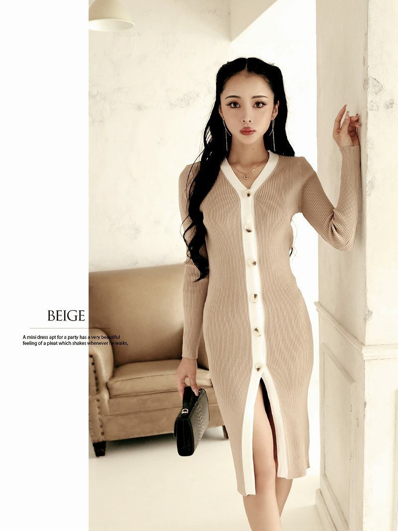 5. センタースリットバイカラー袖付きリブニット韓国キャバワンピース KANO 着用 ドレス【DAYS PIECE】(M)(ピンク/ベージュ/ブラック/ブルー) ptpl