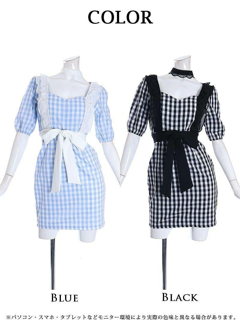 韓国っぽデザインでキュートに♪ ギンガムチェック柄袖付き谷間魅せキャバクラドレス ミニドレス【Ryuyu】(S/M/L)(ブラック/ブルー)