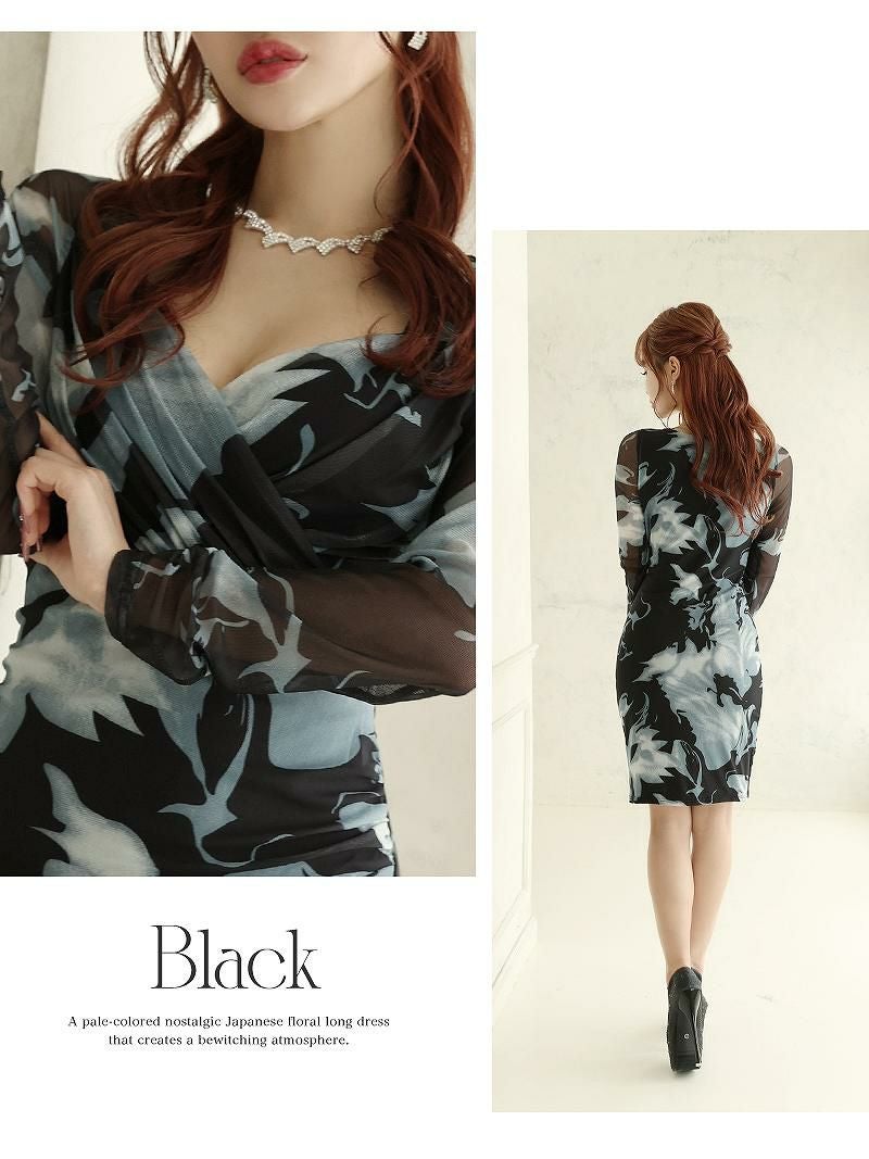 カシュクールデザインとメッシュの長袖がエレガントさを演出し、袖付きで気になる部分も体型カバーが可能です。