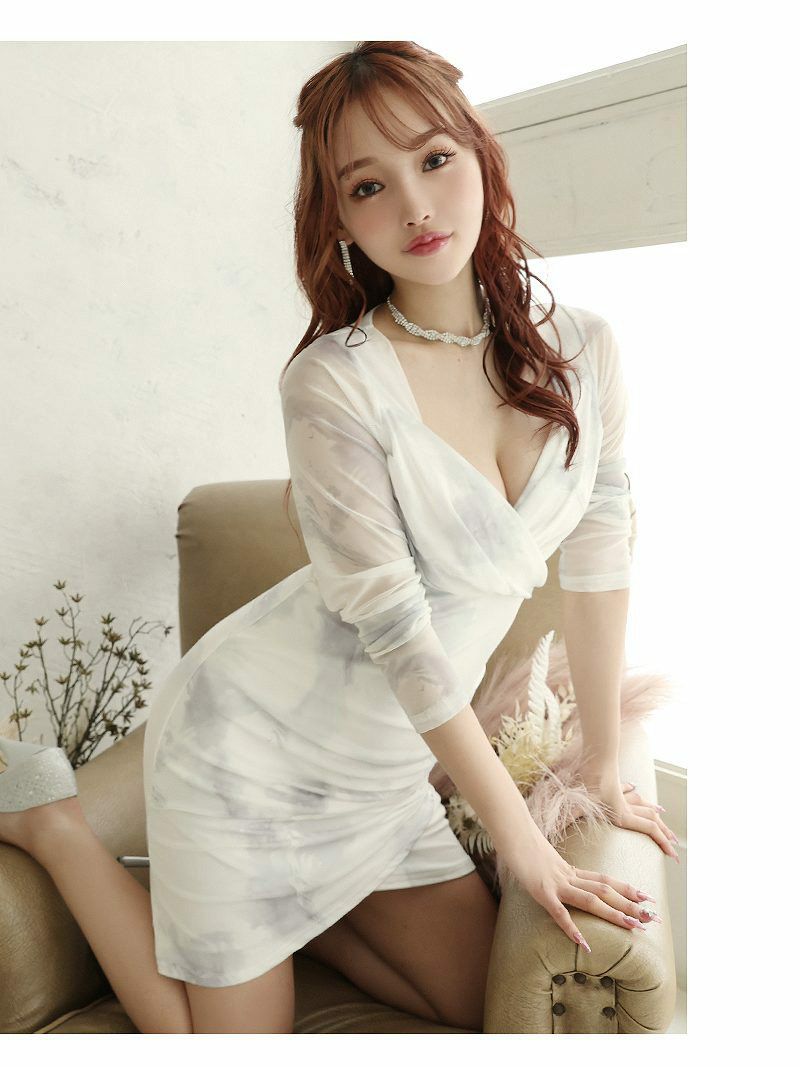メッシュ素材を使ったカシュクールデザインの長袖ミニドレス。