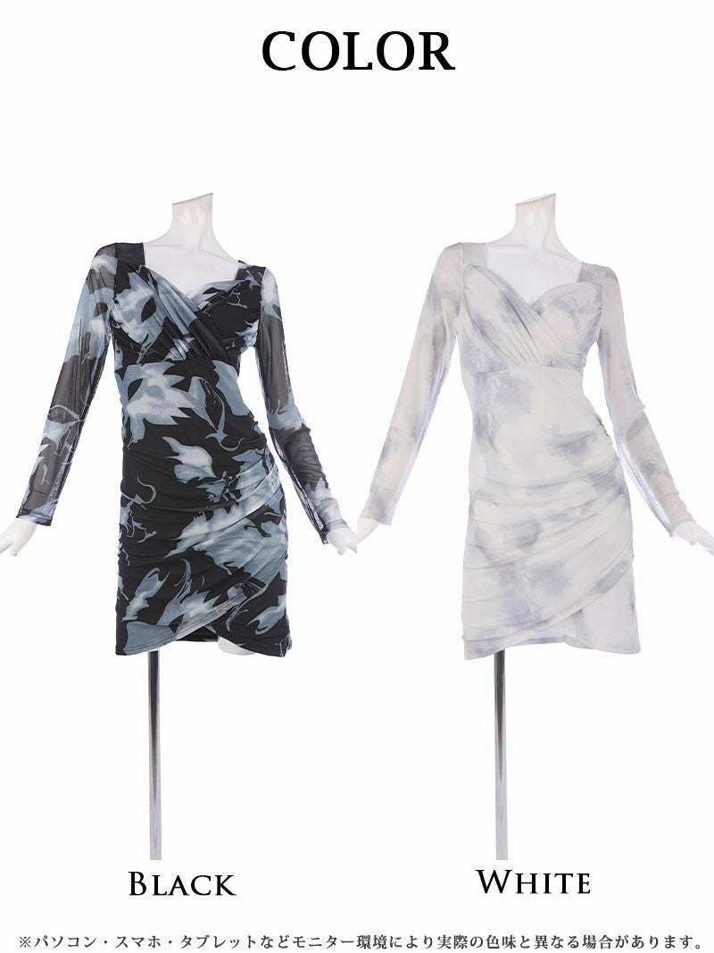 5. シアー長袖プリント柄タイトミニドレス【Ryuyu】(M)(ホワイト/ブラック) ptpl