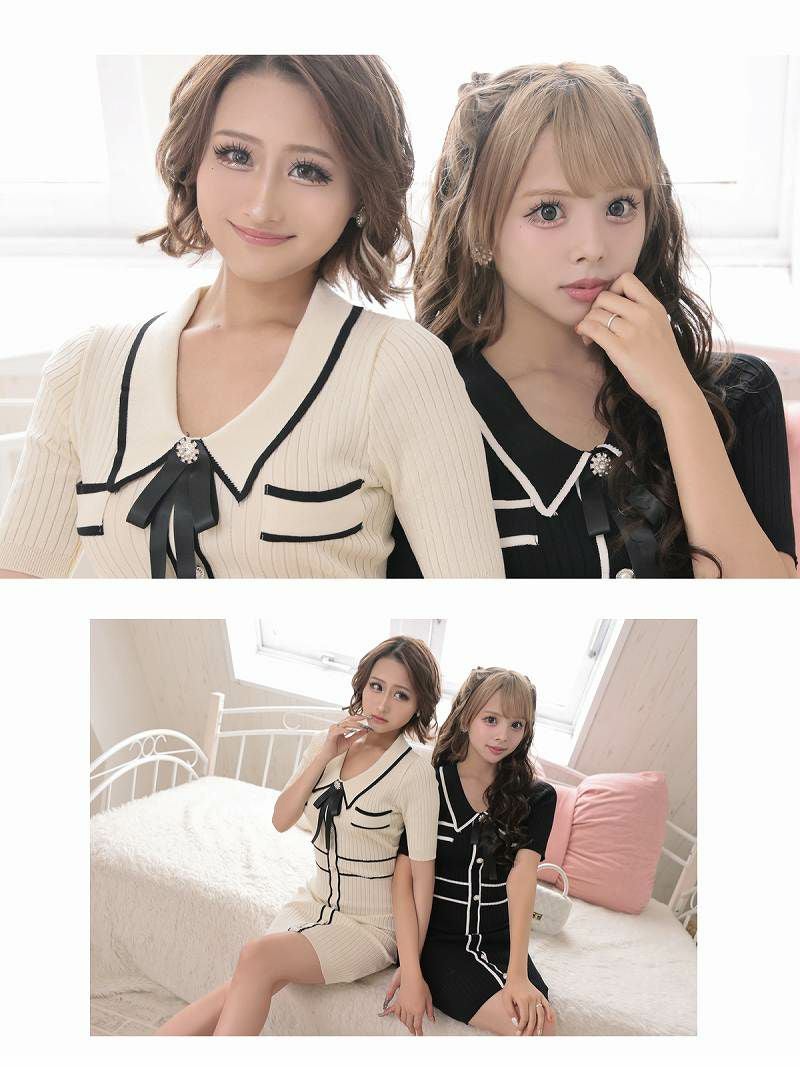 4. ブローチ付ソフトニット韓国風ワンピース キャバクラワンピース【RyuyuChick】(M)(アイボリー/ブラック)