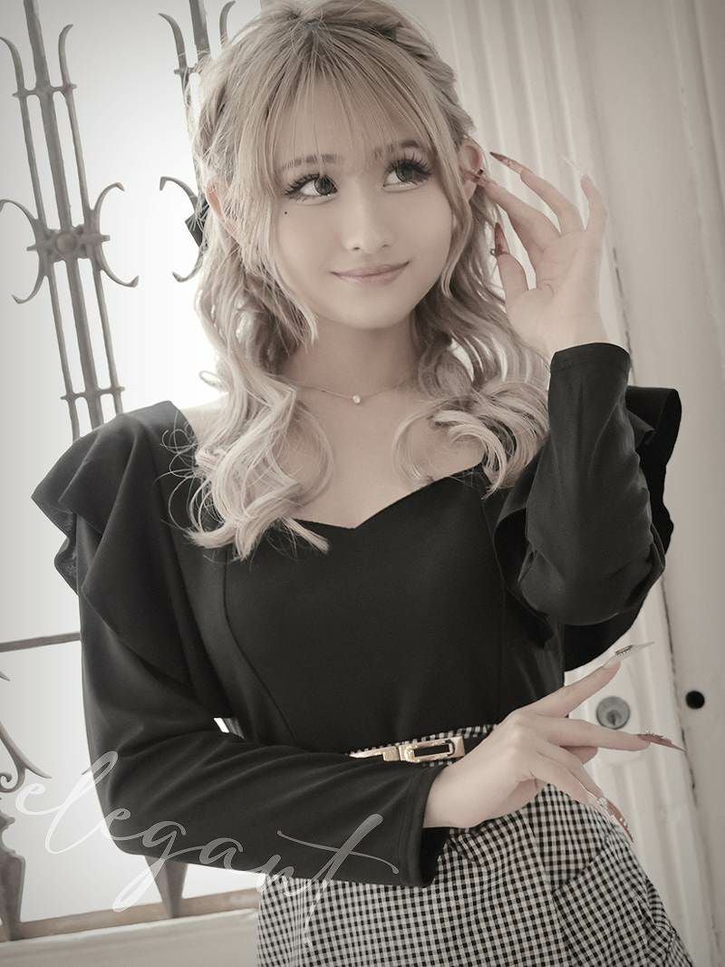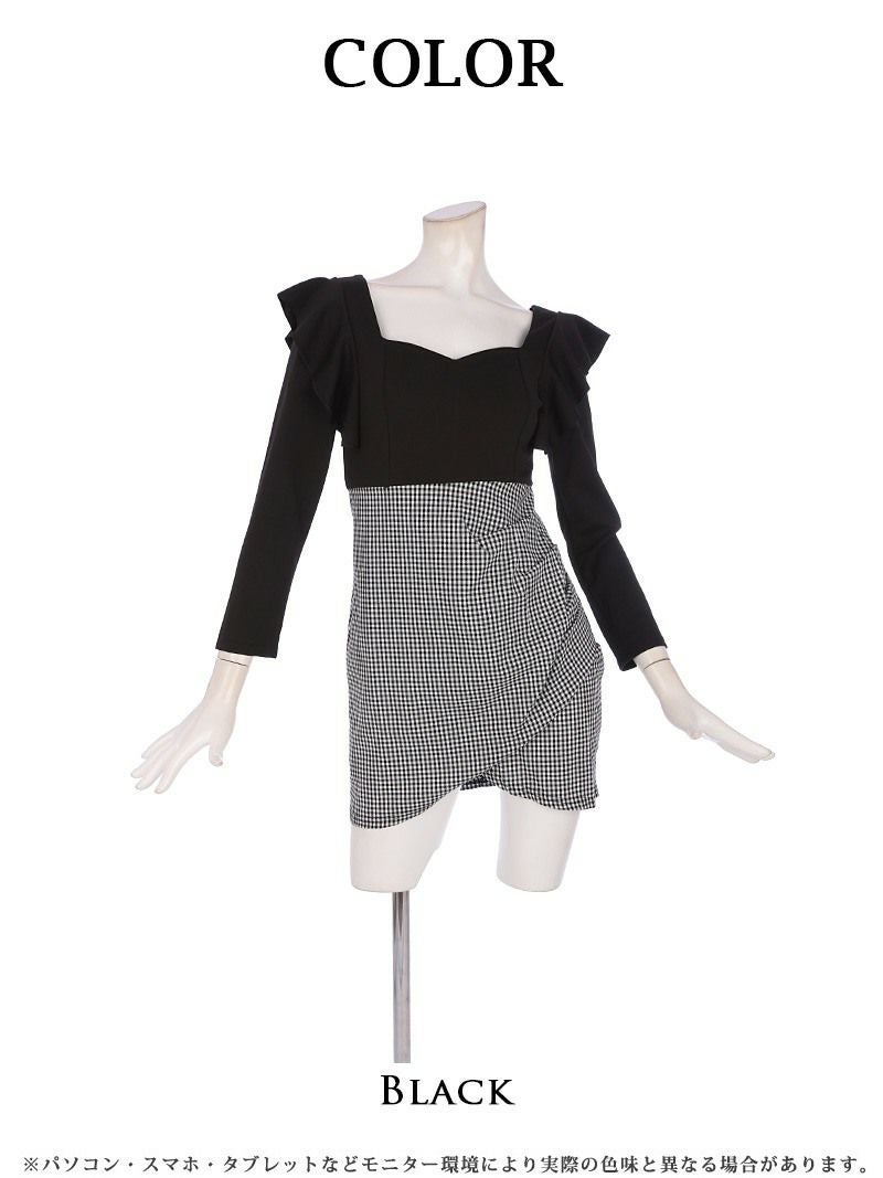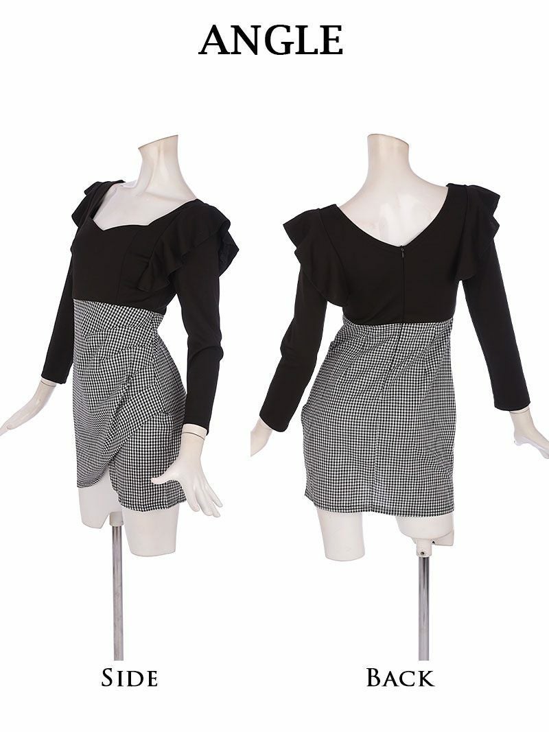 フリル袖チェック柄モノトーンキャバワンピース あいみん 着用 長袖キャバドレス【RyuyuChick】