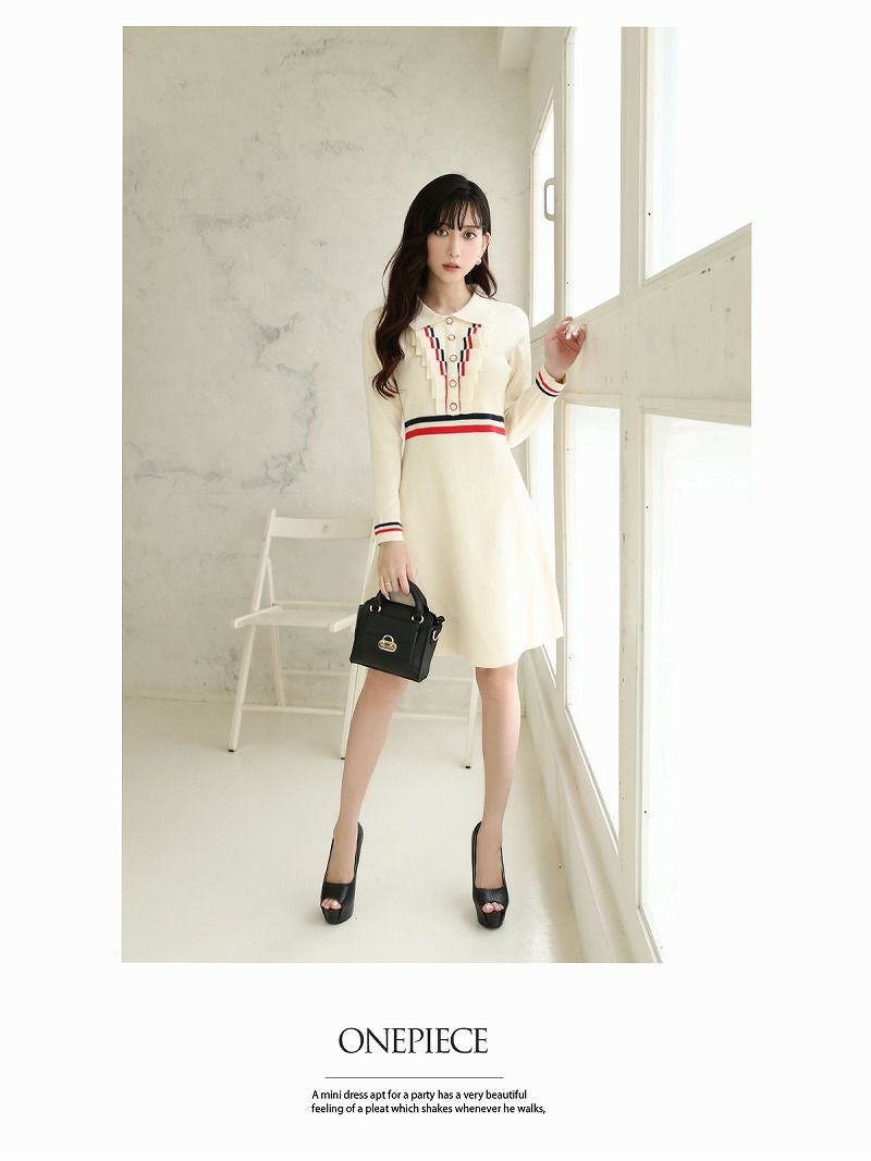 5. 襟付きフレアーニットワンピース 加賀美早紀 着用キャバワンピース【Belsia】(M/L)(アイボリー) ptpl