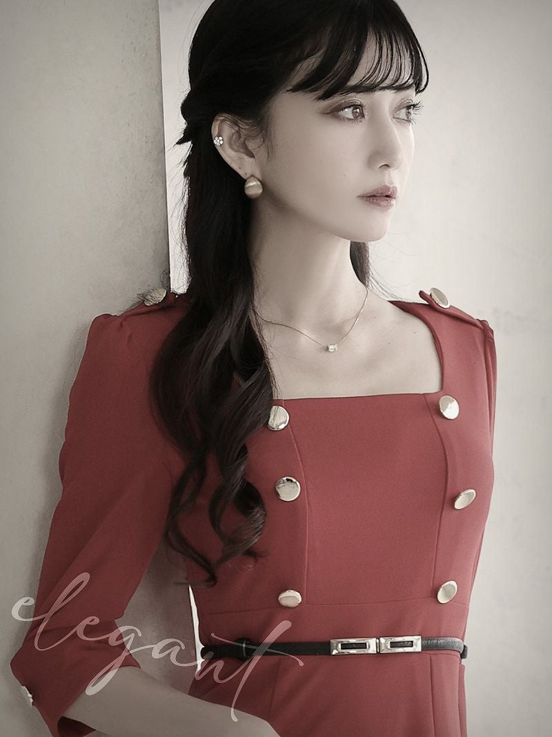 7. 五分袖ダブルボタン韓国風キャバワンピース 加賀美早紀 着用膝丈ラウンジワンピース【Belsia】(S/M/L/XL)(レッド)