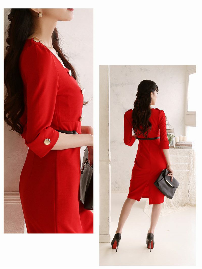 4. 五分袖ダブルボタン韓国風キャバワンピース 加賀美早紀 着用膝丈ラウンジワンピース【Belsia】(S/M/L/XL)(レッド)