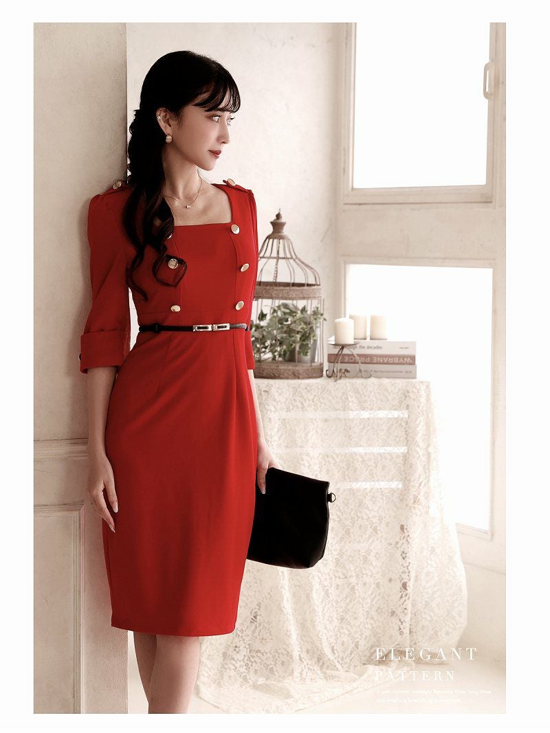 同伴やラウンジにぴったりなエレガントワンピース 五分袖ダブルボタン韓国風キャバワンピース 加賀美早紀 着用膝丈ラウンジワンピース【Belsia】(S/M/L/XL)(レッド)