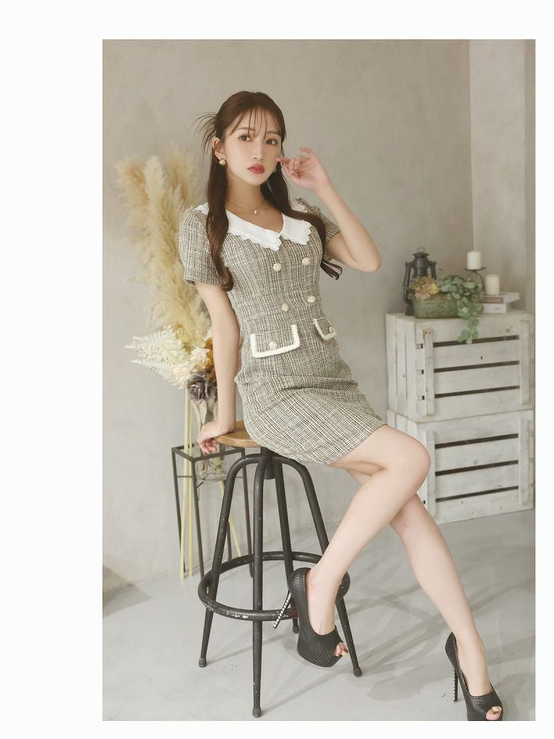レース襟が上品で可愛い、チェック柄のツイードミニキャバドレス。
