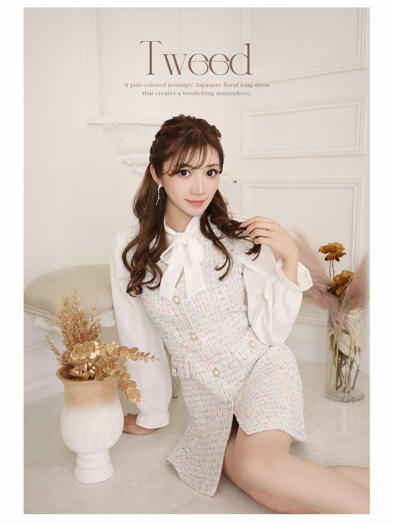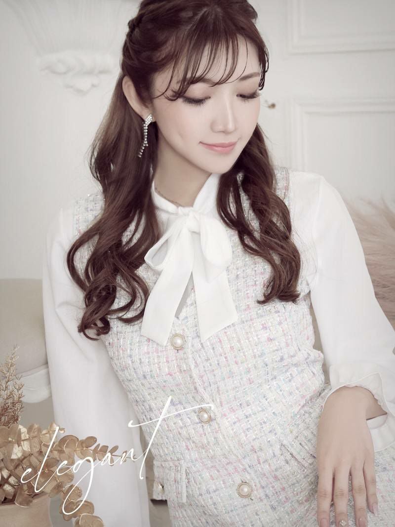 首元のボウタイリボンとツイードの組み合わせがとびっきり可愛いキャバワンピースです。