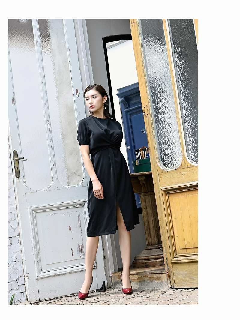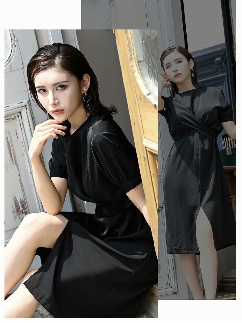 韓国風デザインが魅力の膝丈キャバワンピース。上品なバルーン袖とウエストマークがスタイルを美しく引き立て、大人のエレガンスを演出します。
