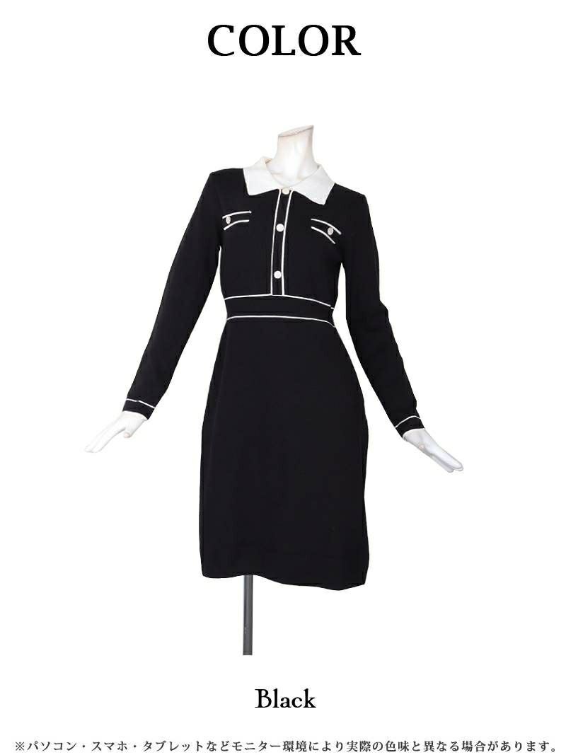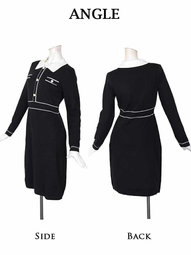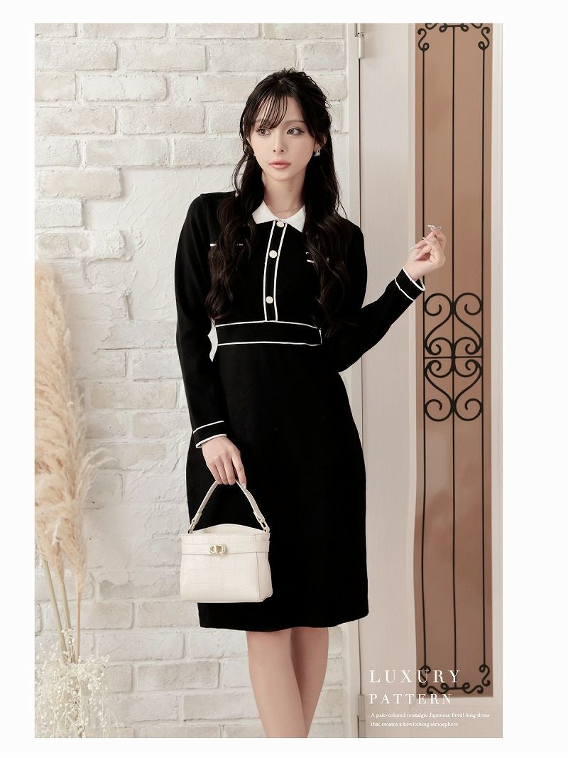 洗練された美オーラ纏う モノトーン襟付き長袖ニットタイトキャバワンピース KANO 着用 韓国ワンピース【DaysPiece】(M/L)(ブラック)
