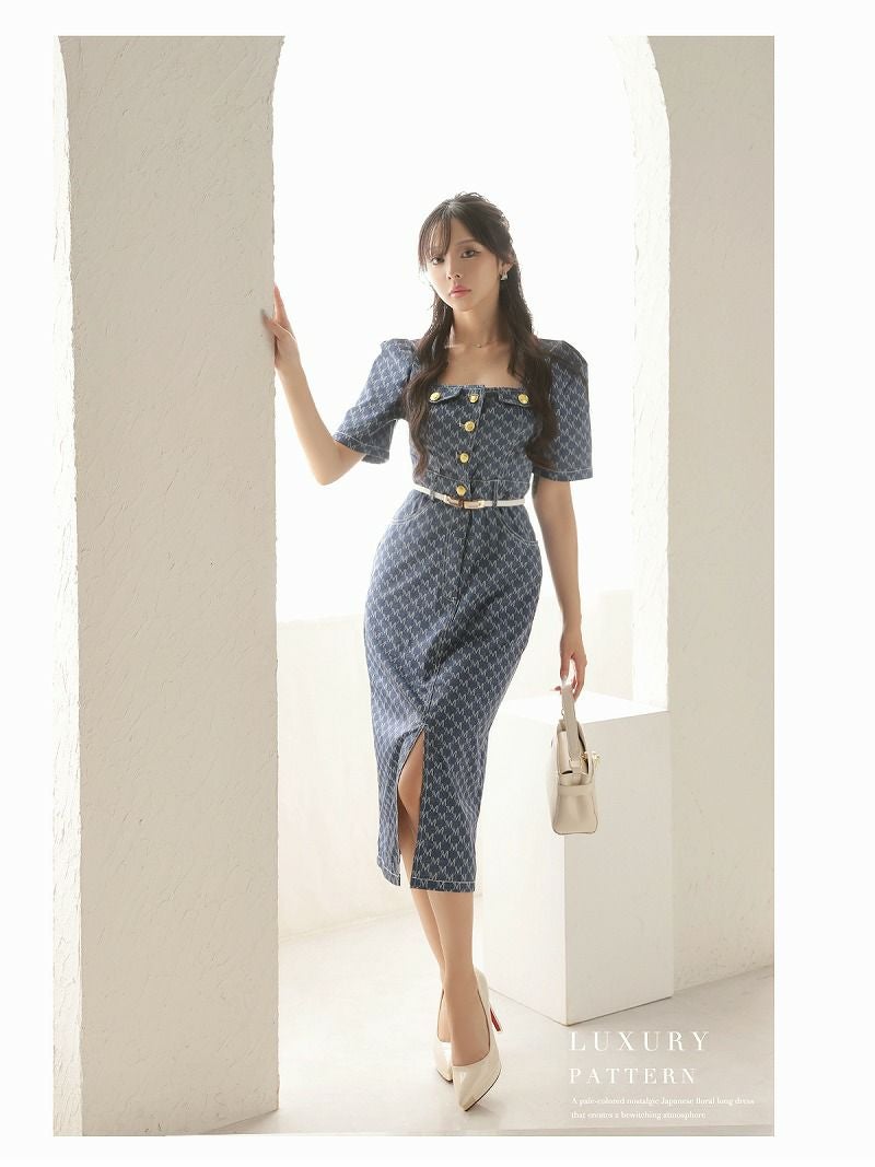 上品なデニム素材で仕立てた膝丈の韓国ワンピース。