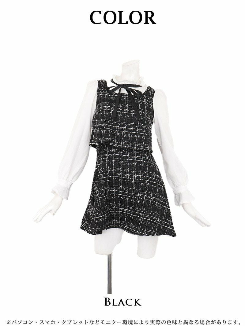 ボータイリボンとツイードで愛らしく!一枚でセットアップ風に着こなせるドッキングワンピ。 先行予約割¥4680→¥4446!※一部予約販売※上品セットアップ風ボータイリボンのミックスツイードミニドッキングワンピ りせり 着用キャバワンピース【Ryuyu】(S/M/L/XL(2L))(ブラック)