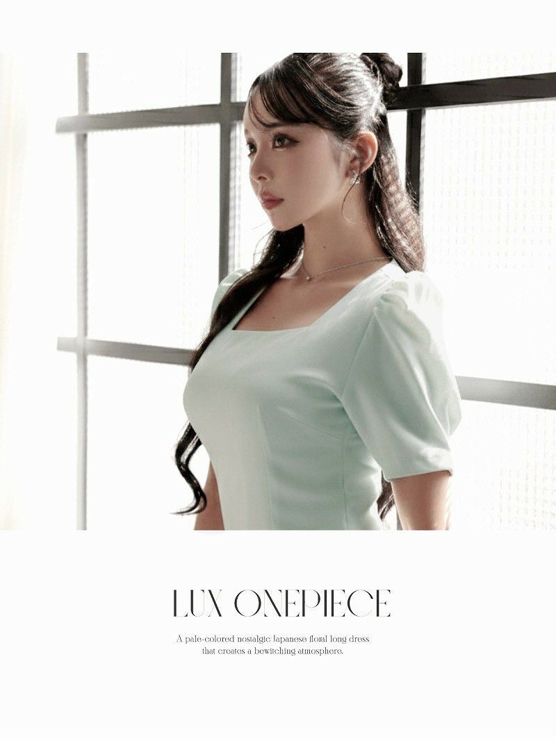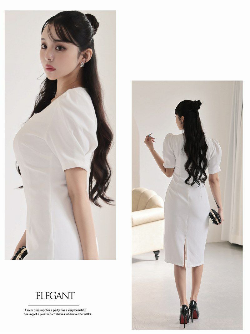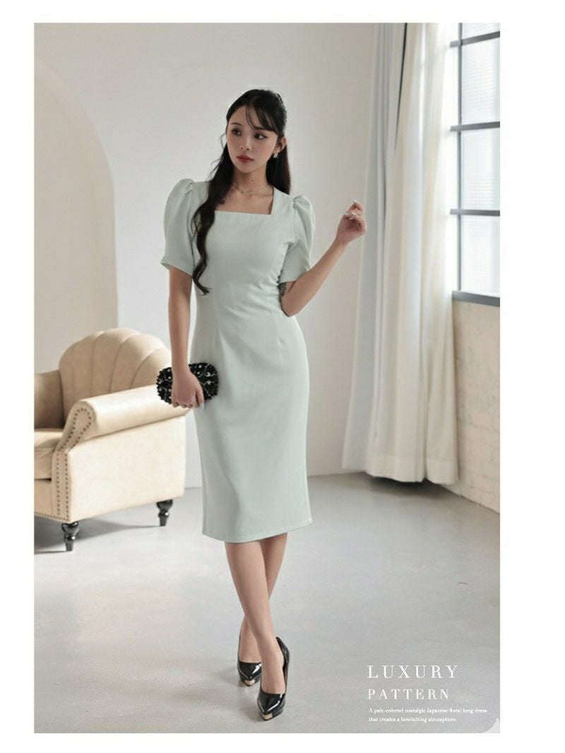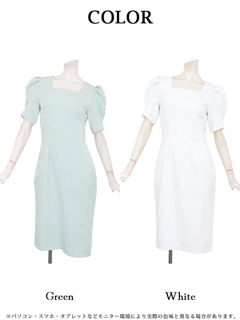 6. スクエアネックの美デコルテとパフ袖が大人可愛いミディ丈韓国風ワンピース KANO 着用 キャバワンピース【DaysPiece】(S/M/L)(ホワイト/グリーン)