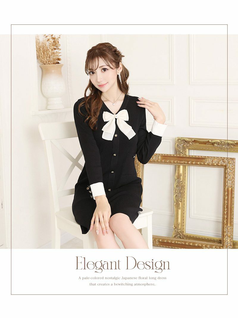 お仕事も普段も大人かわいい私になれる! モノトーンリボン袖付きニットキャバワンピース【Ryuyu】(M)(ブラック)