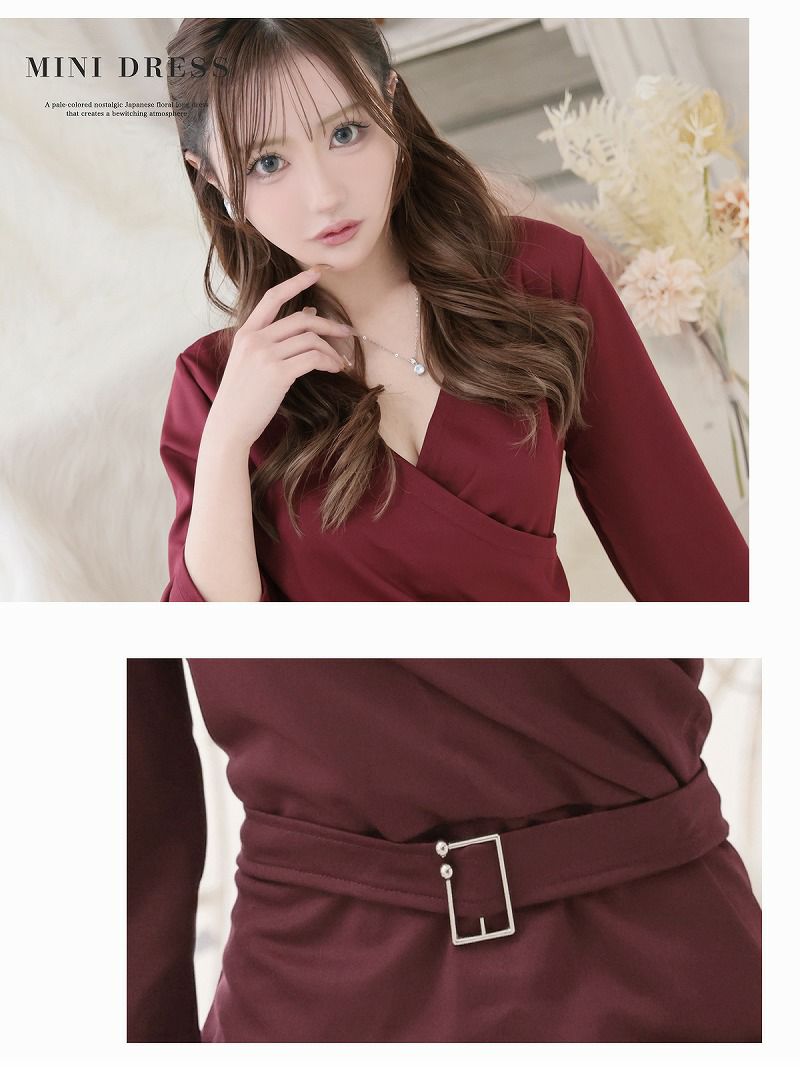 ※一部予約販売※カシュクールVネックベルト付き七分袖タイトワンピース 上品な膝丈無地キャバドレス りせり 着用 キャバドレス【RyuyuChick】