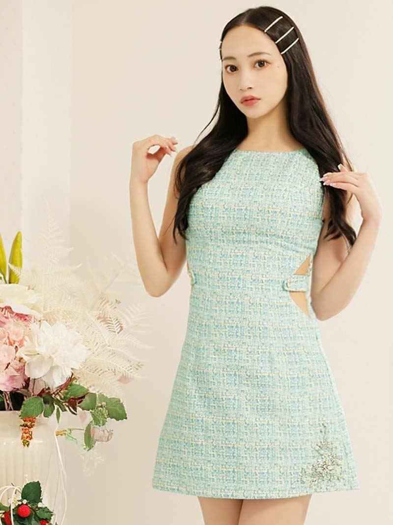 ウエストのリボンで脚長効果◎ 総レースカッティングデザイン韓国キャバクラワンピース【DAYS PIECE】(S/M/L/XL)(ピンク/ブルー/ベージュ)