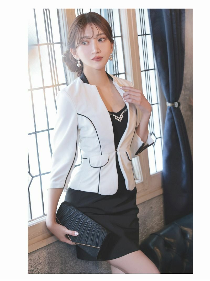 クールな白地に映える黒のパイピングが目を引く、洗練されたデザインのノーカラージャケットが登場!