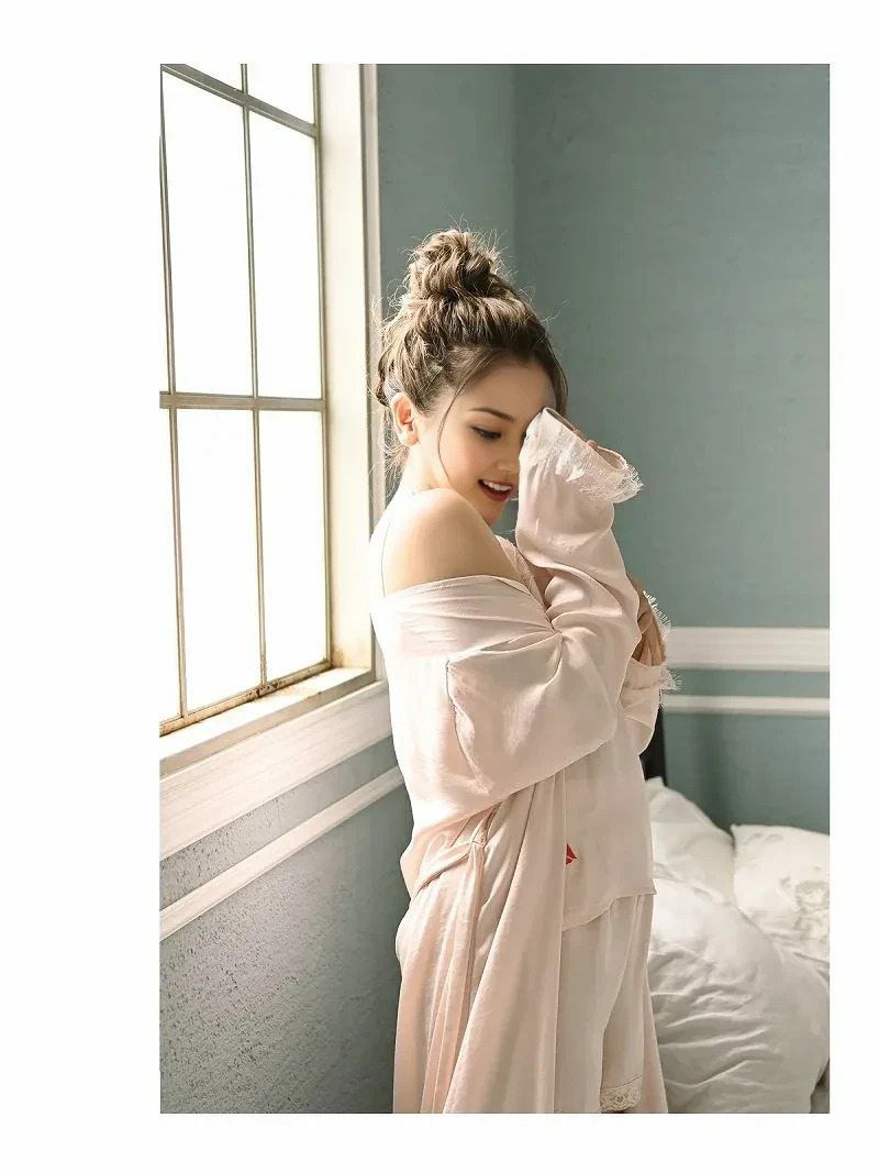 上品なサテン風の光沢感と、なめらかな落ち感が心地良いガウンとキャミとショートパンツの3点セットのナイトウェア。