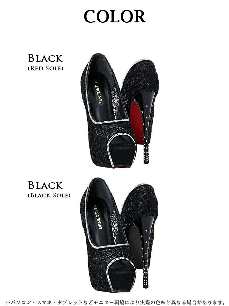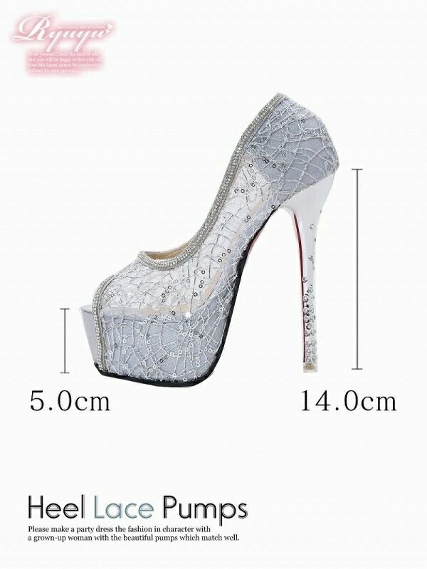 華やかな輝きで魅了する 煌スパンメッシュレースビジューオープントゥキャバパンプス【Ryuyu】14.0cmヒール 美脚(S/M/L)(ブラック(赤ソール)/シルバー(赤ソール)/ブラック(黒ソール)/シルバー(黒ソール))