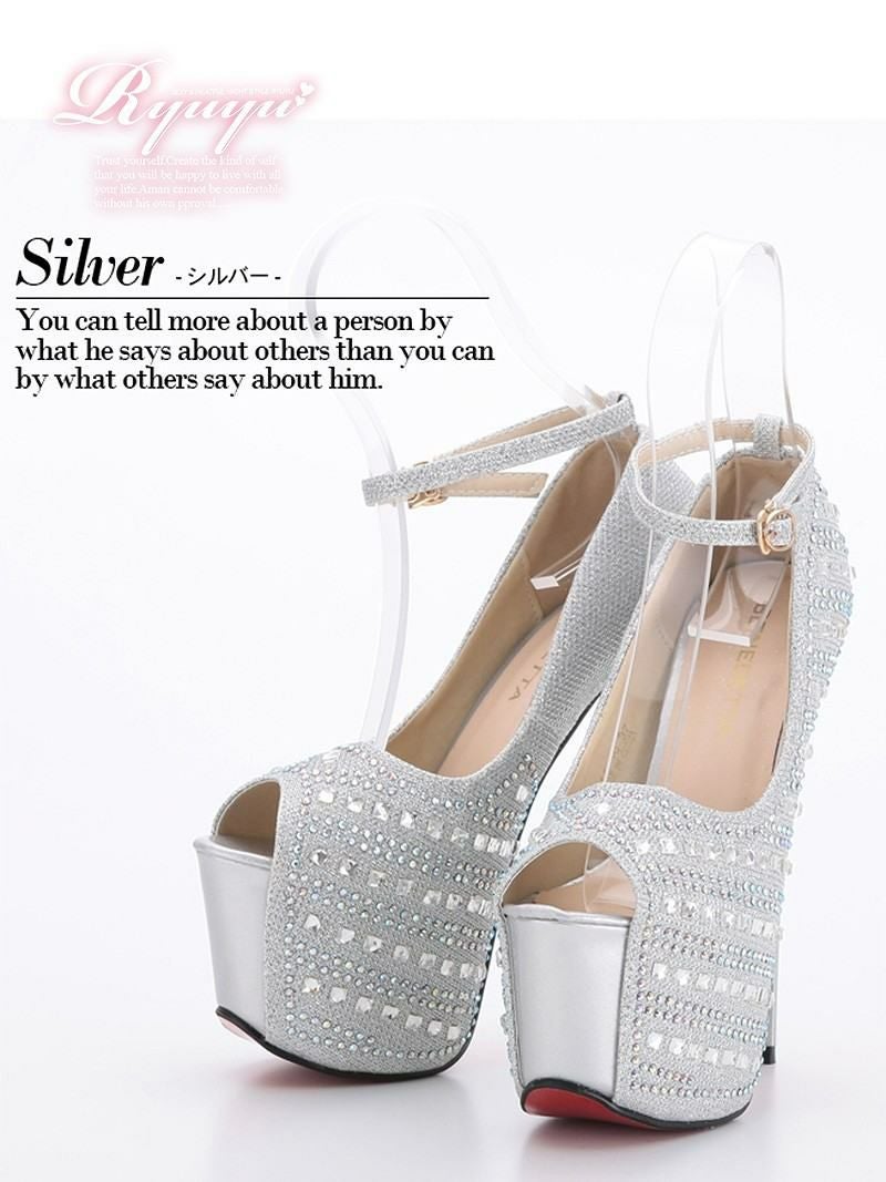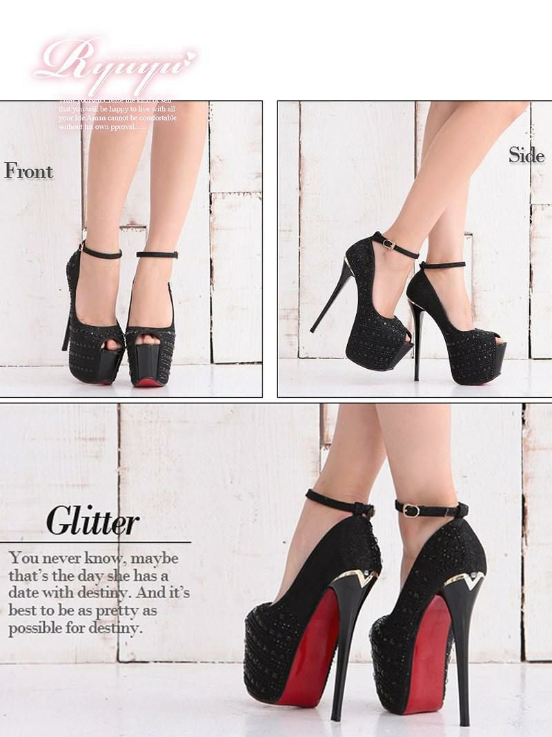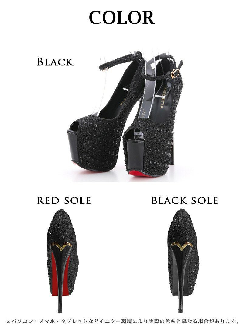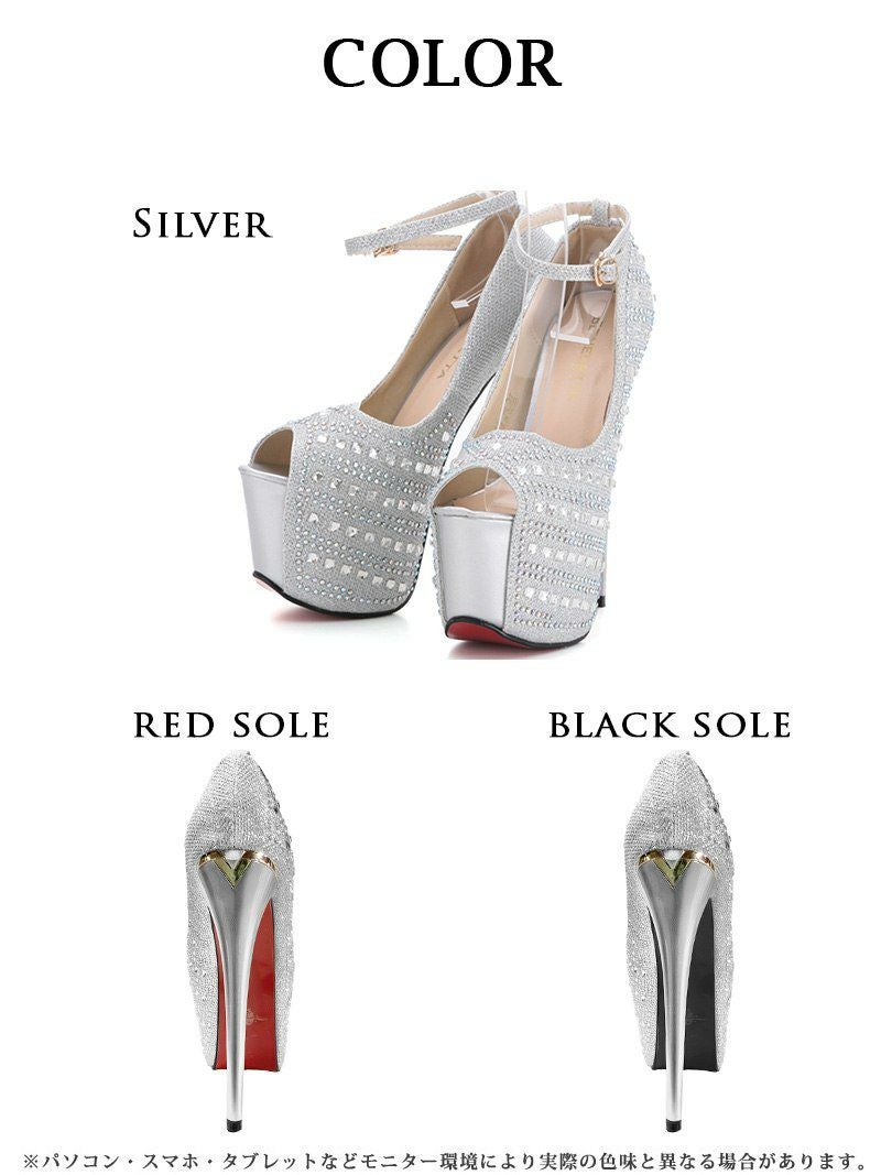 美脚を彩る、華やかな輝き 煌stone美脚オープントゥキャバパンプス【Ryuyu】極前厚アンクルストラップヒールパンプス(XS/S/M/L)(ブラック(赤ソール)/シルバー(赤ソール)/ブラック(黒ソール)/シルバー(黒ソール))