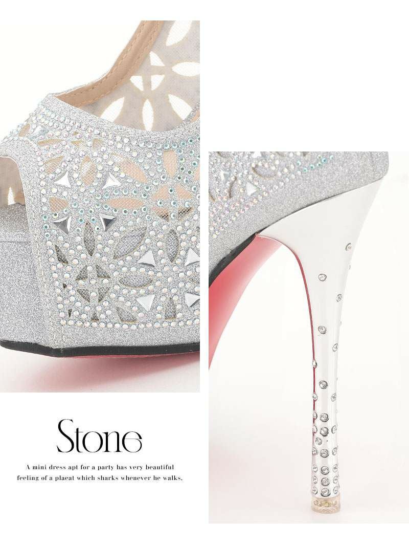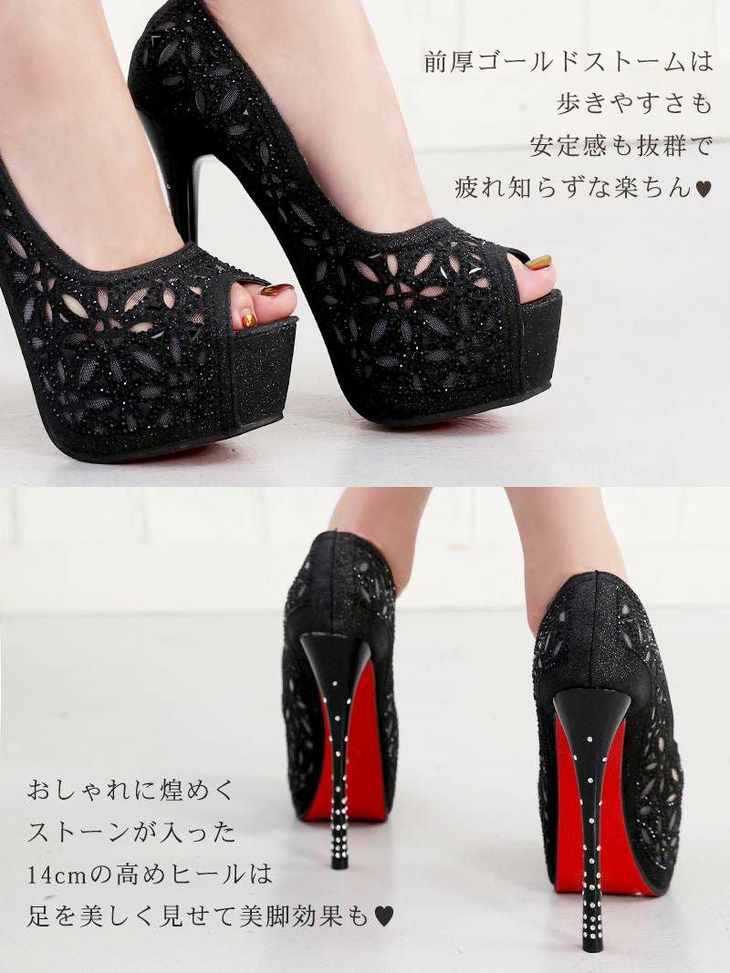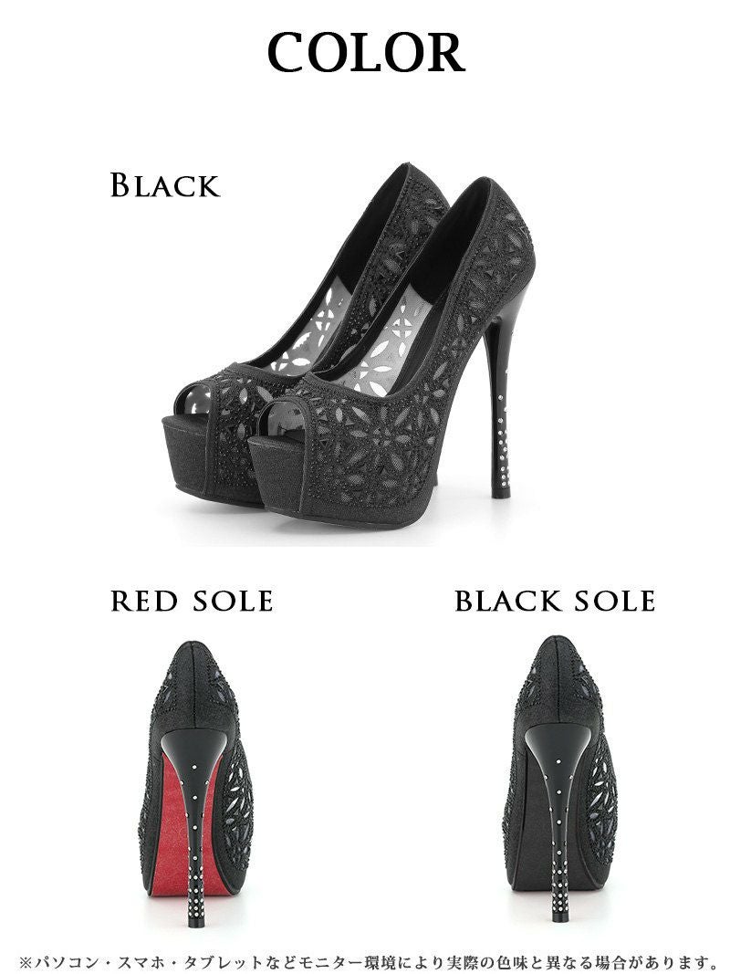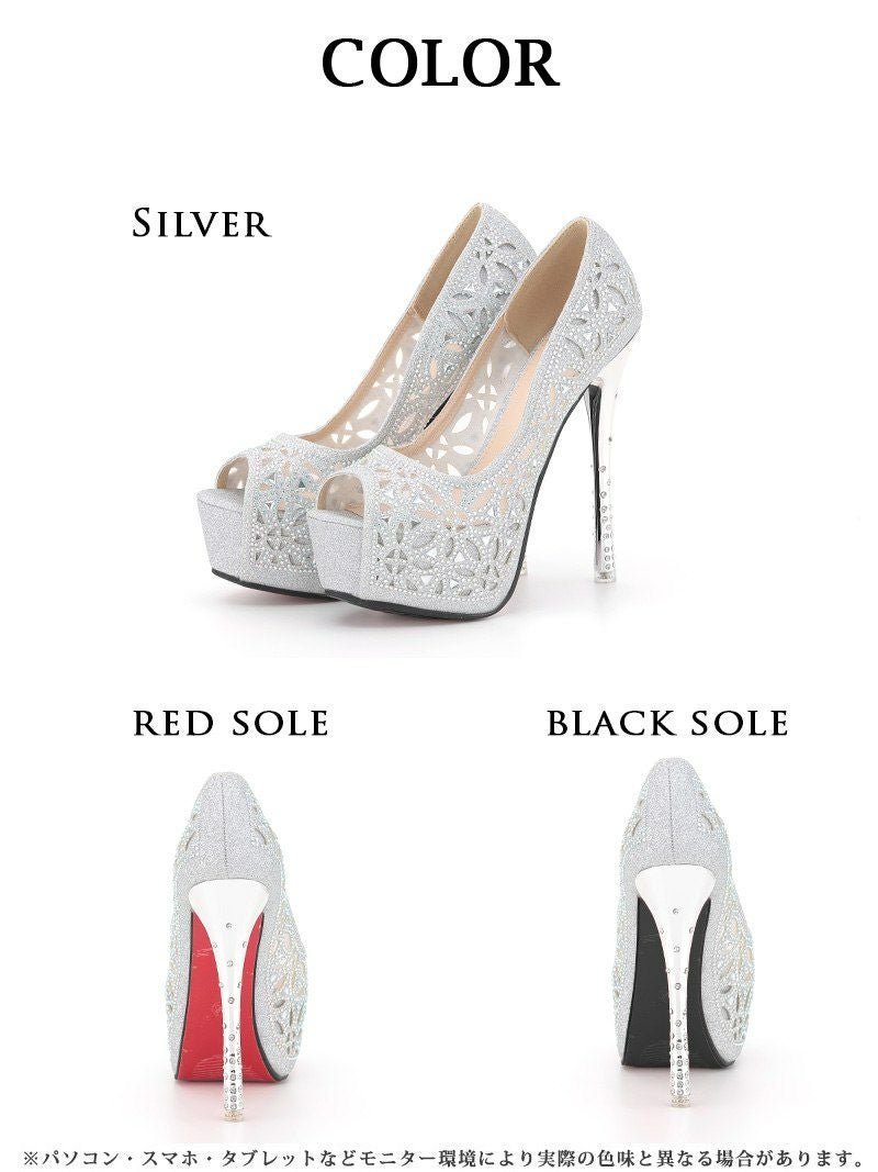 歩きやすさも快適な高ヒール フラワーカッティングビジューパンプス【Ryuyu】(XS/S/M/L)(ブラック(赤ソール)/シルバー(赤ソール)/ブラック(黒ソール)/シルバー(黒ソール))