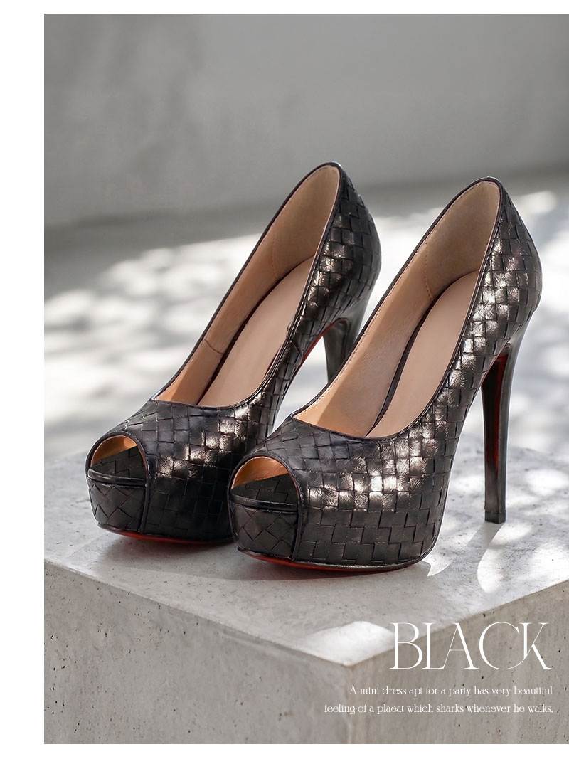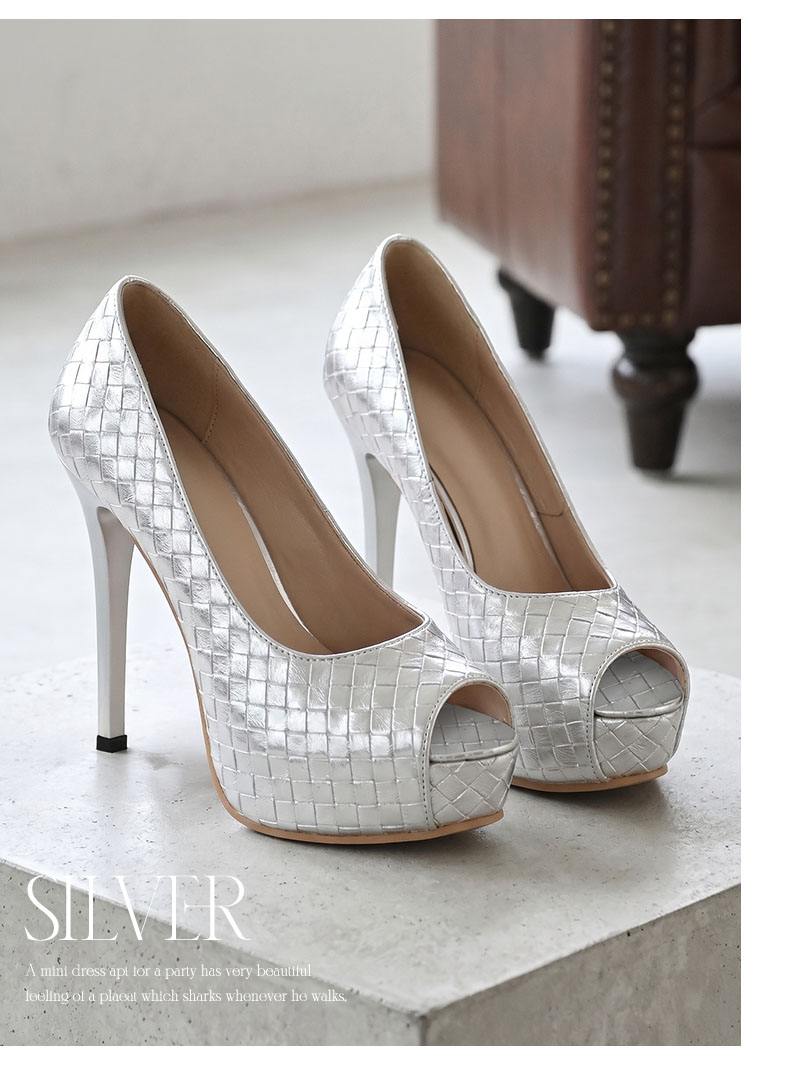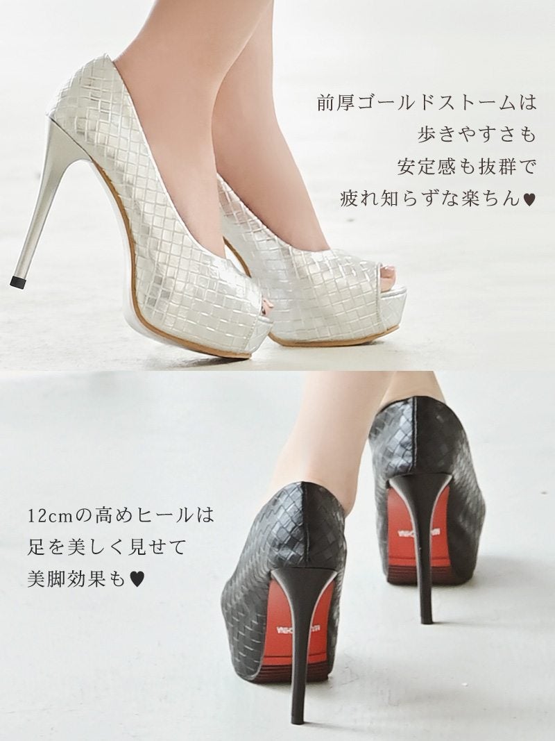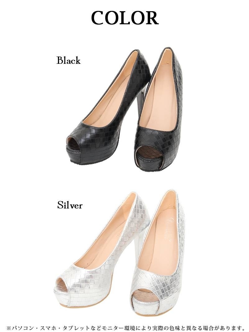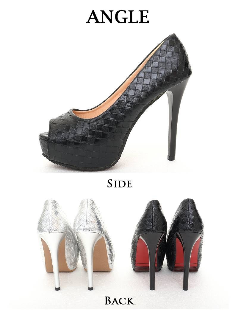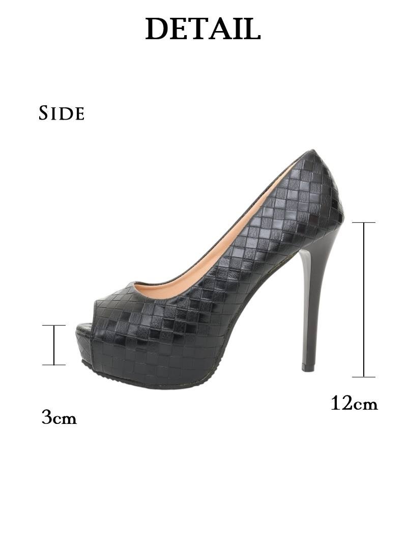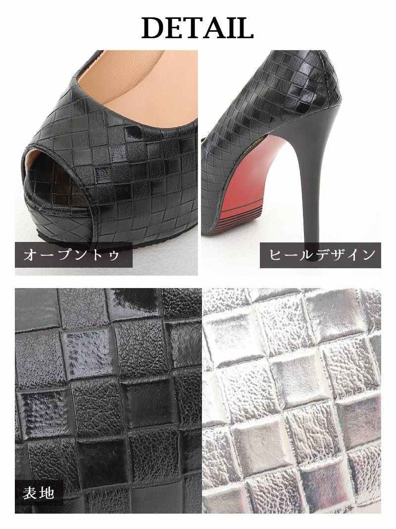 4. 12cmヒールの圧倒的な美脚効果と格子柄デザインがおしゃれな厚底オープントゥパンプス 【Ryuyu】(XS/S/M/L/XL)(ブラック/シルバー)