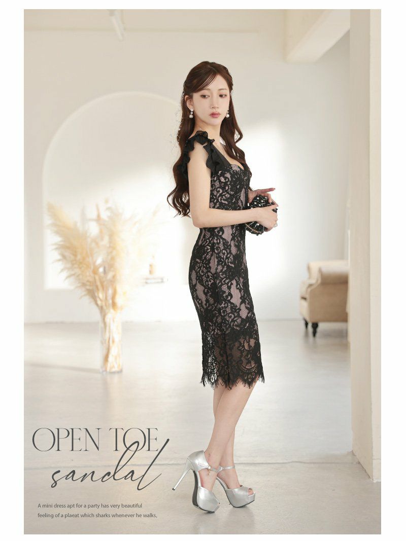 レースをあしらった高級感漂うデザイン 艶フロッキーレース15.5cmヒールキャバサンダル【Ryuyu】(S/M/L)(ブラック/シルバー)