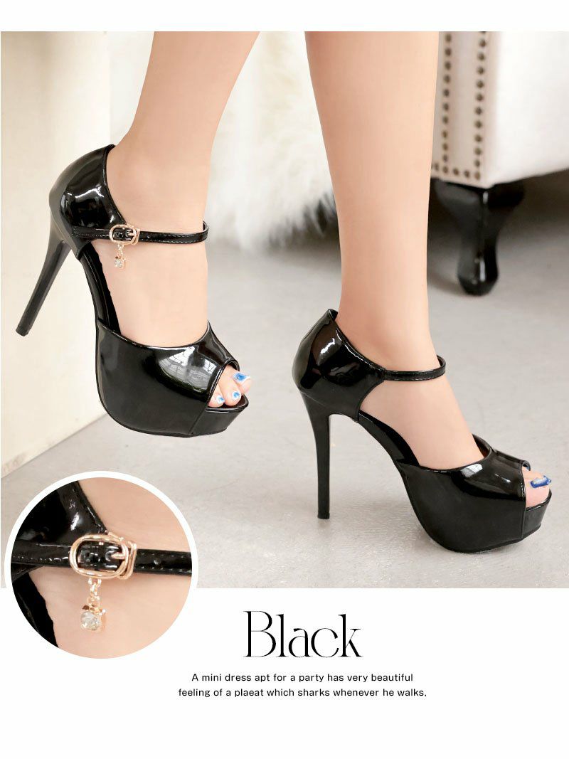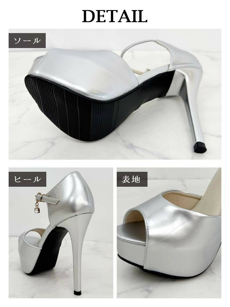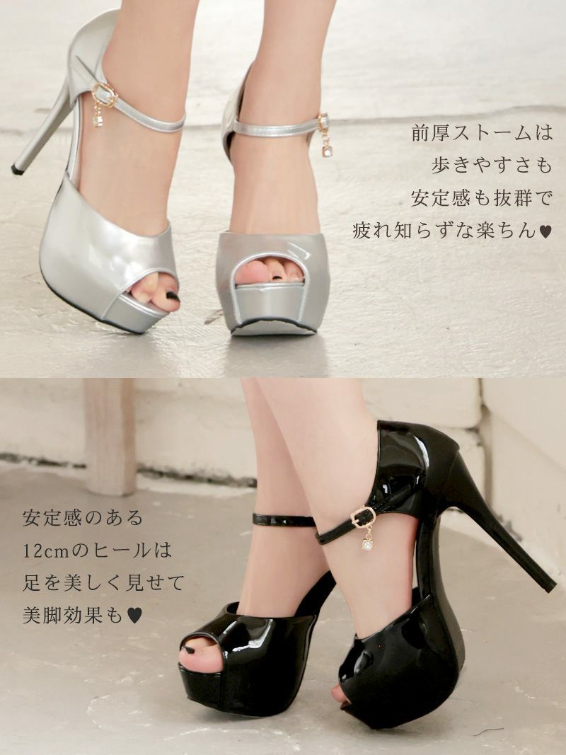 12cmヒールと前厚ストームの魔法で、誰もが見惚れる最上級の美脚ラインを手に入れる。 12cmヒールストラップ付き前厚エナメルサンダル オープントゥキラキラチャーム付きキャバパンプス 【Ryuyu】(XS/S/M/L/XL)(ブラック/シルバー/ベージュ)