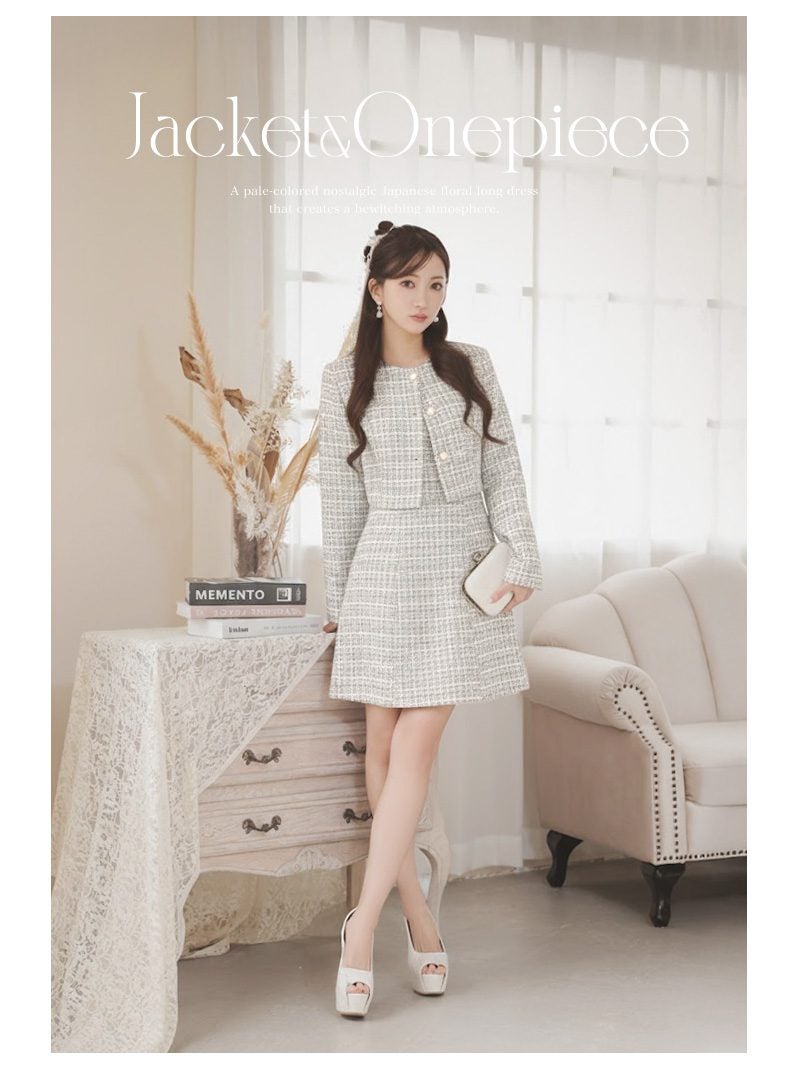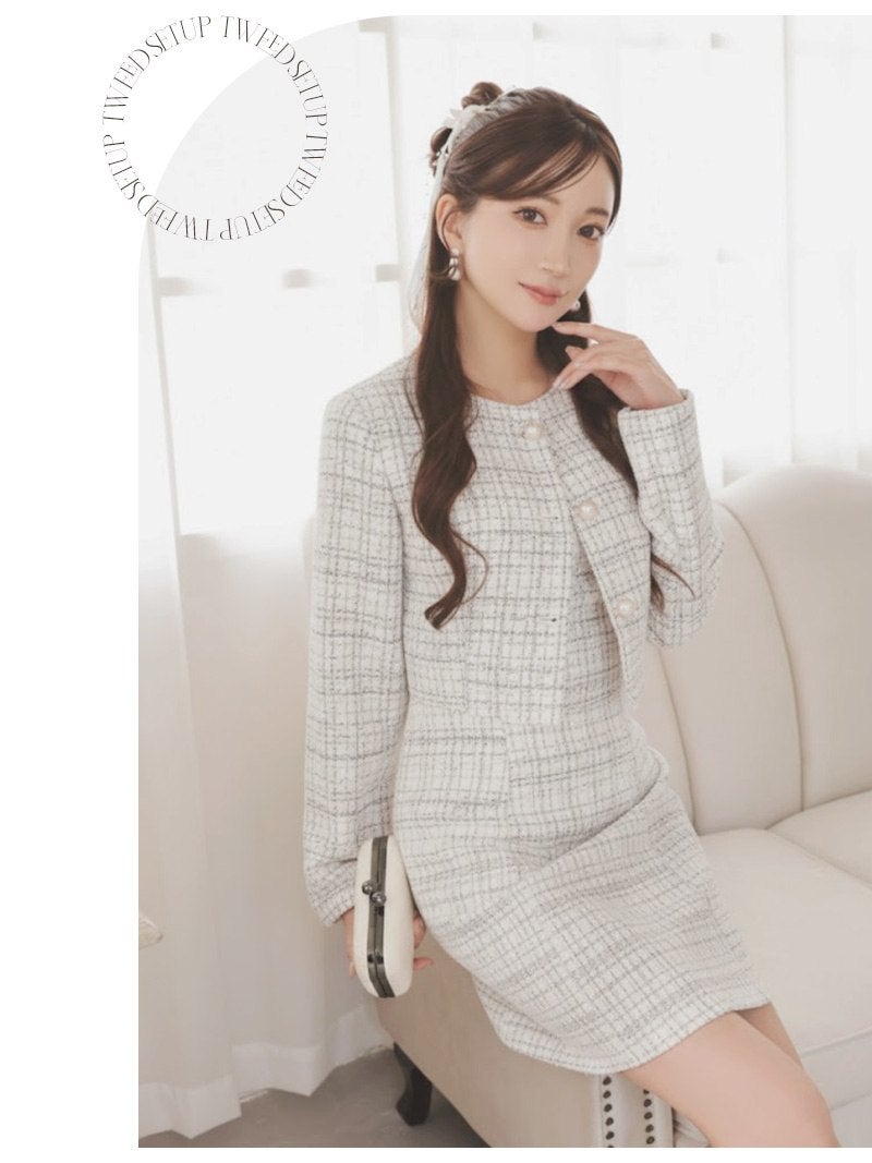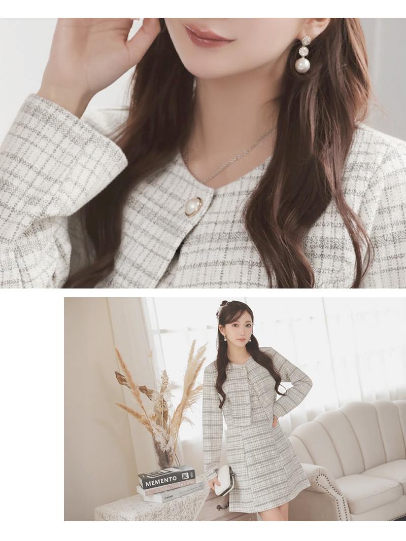 パールボタンとラメツイードで品格を纏う、清楚系チェック柄ワンピーススーツ。 先行予約割¥6980→¥6630!※一部予約販売※パールボタンが上品に輝くノーカラーのニットツイードチェック柄ワンピーススーツ 【Ryuyu】(XS/S/M/L)(ピンク/ブルー/ホワイト)