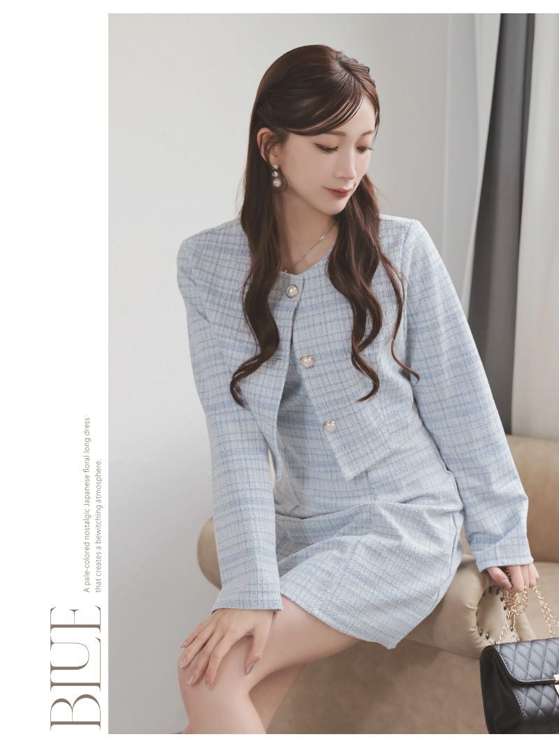 上品さの中に可愛さも秘めたママスーツ! カラーツイードパイピングチェック柄レディースフォーマルスーツ 加賀美早紀 着用 キャバスーツ【BelsiaLUX】(S/M/L)(ブラック/ブルー)
