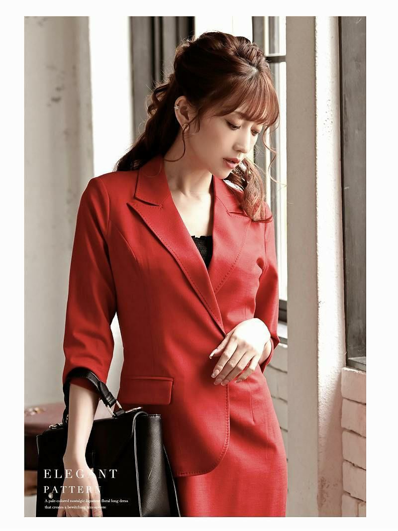 オレンジカラーとダークネイビーカラーが個性的でおしゃれ感度高まるレディーススーツはドッキングデザインになっていて1枚でスタイリングが完成するキャバスーツとなっています。
