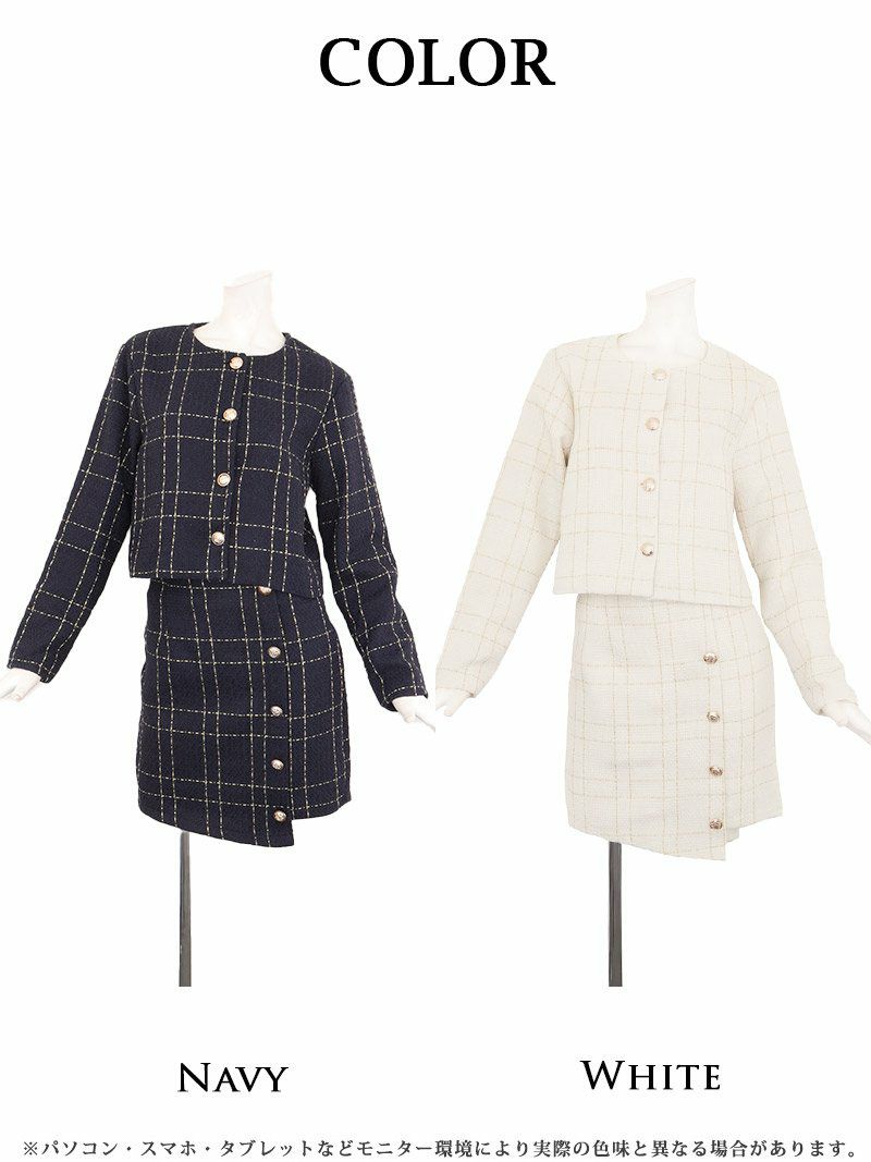 品格を纏うクラシカルなツイードセットアップで、一目置かれるレディな装いに。 先行予約割¥7390→¥7021!※一部予約販売※上品ツイードのクラシカルチェック柄セットアップスーツ(S/M/L/XL(2L))(ホワイト/ネイビー)