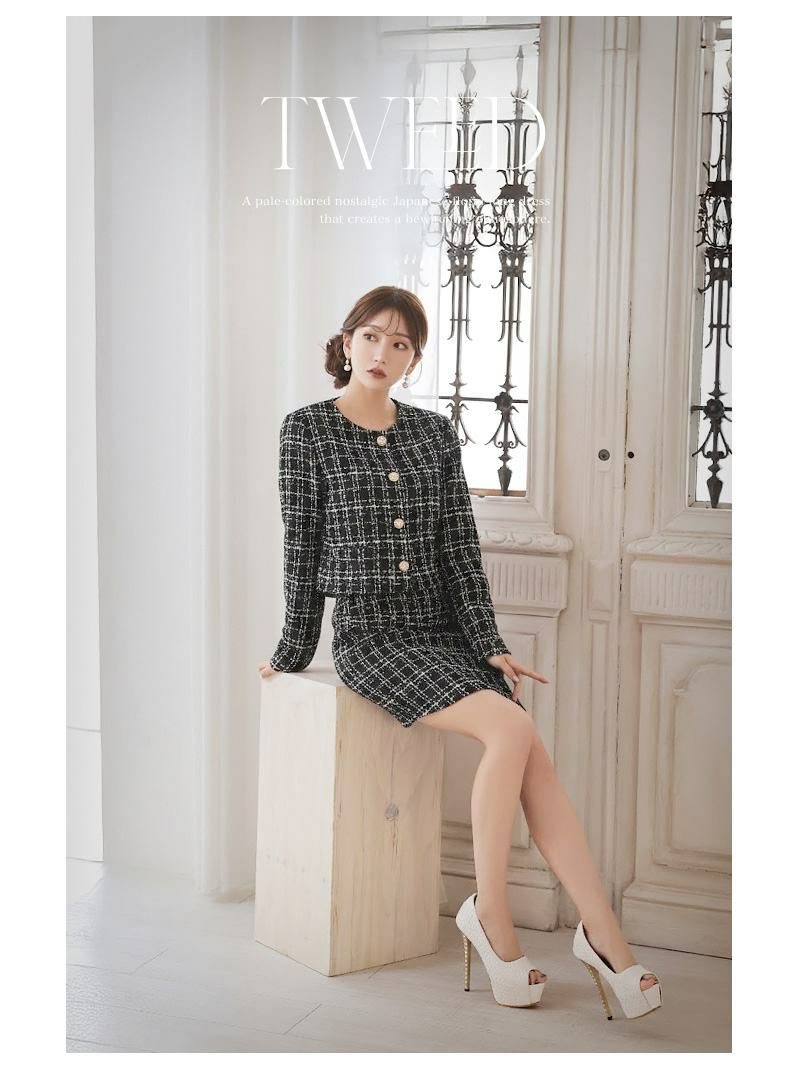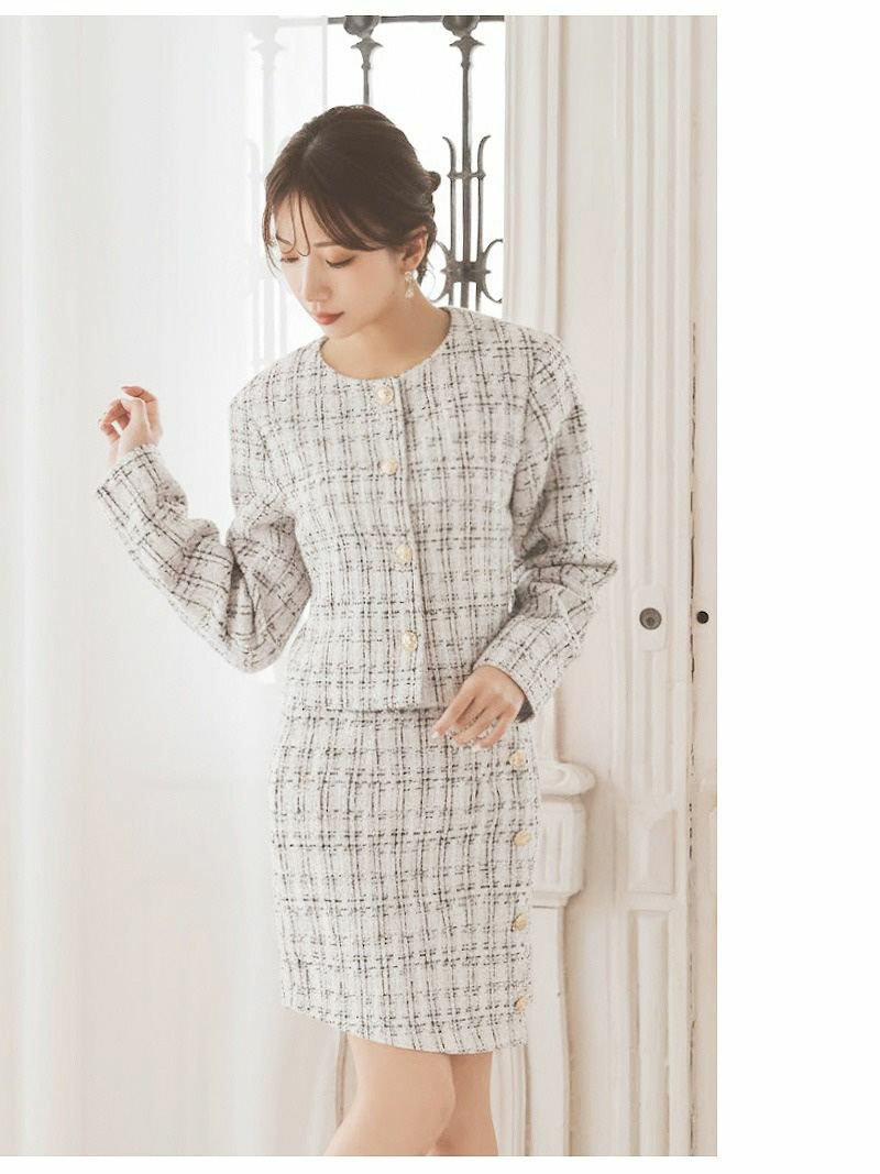 クラシカルなチェック柄のツイード素材が知的な色っぽさを演出するセットアップドレスです。
