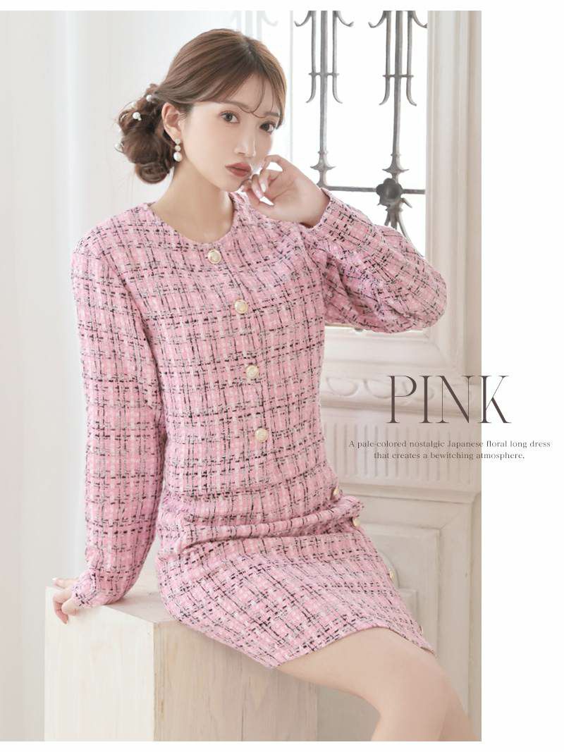 4. ゴールドボタンが華やかなノーカラーチェック柄ツイード長袖セットアップキャバスーツ【Ryuyu】(S/M/L/XL(2L))(ブラック/ピンク/グレー)