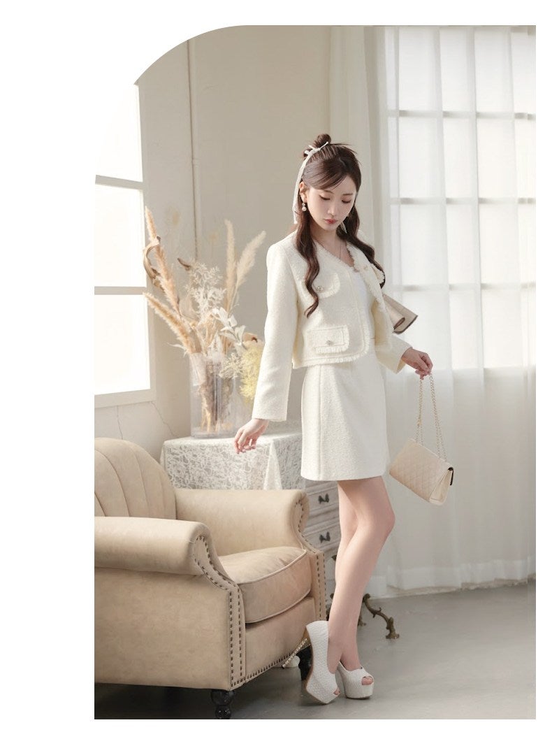 上品なツイード素材とゴールドボタンが映えるフリンジデザインのノーカラースーツセットアップ 【Ryuyu】