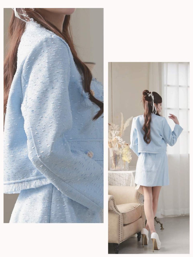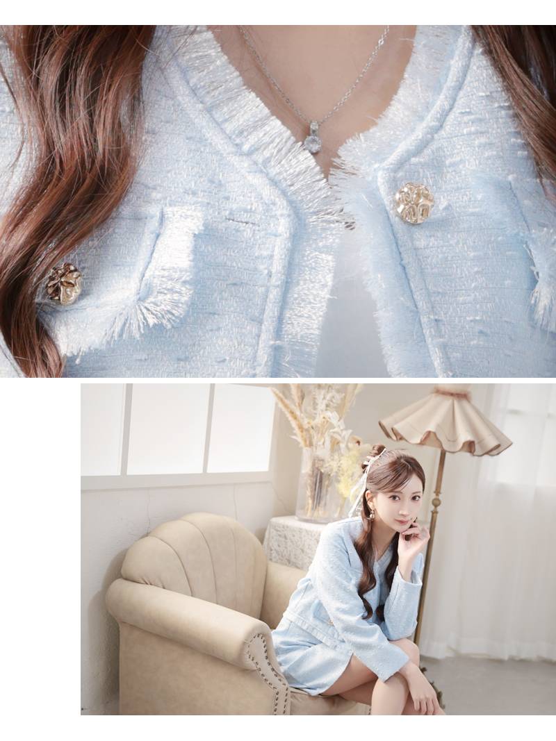 7. 上品なツイード素材とゴールドボタンが映えるフリンジデザインのノーカラースーツセットアップ 【Ryuyu】(S/M/L/XL(2L))(ブルー/オフホワイト)