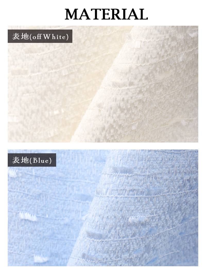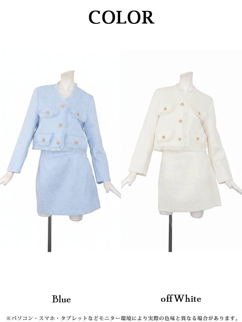 4. 上品なツイード素材とゴールドボタンが映えるフリンジデザインのノーカラースーツセットアップ 【Ryuyu】(S/M/L/XL(2L))(ブルー/オフホワイト)